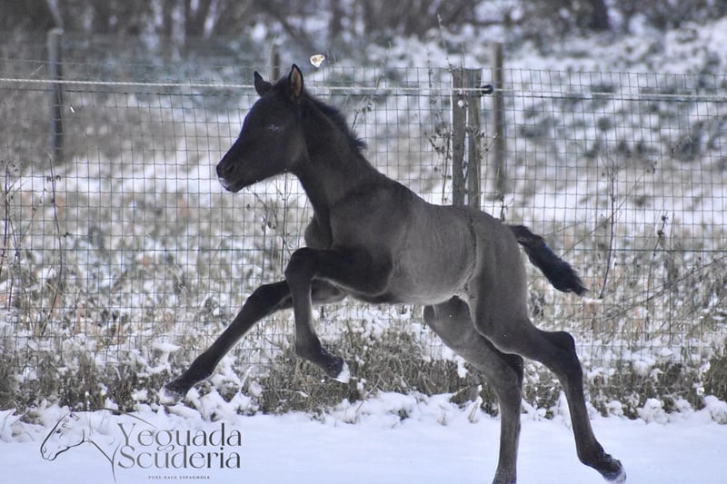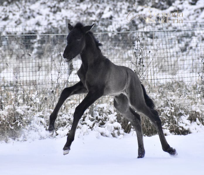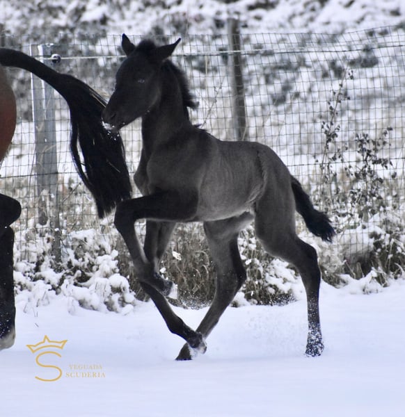 ✨ Stunning black PRE filly, born January 1st, 2026 ✨ By Monje II (Duiker Mor) out of Zara de Scuderia (Poeta de Susaeta x Doblón-TR), Grandiosa de Scuderia shows great promise as a high-quality foal with immense charisma. Very honest, confident, and already very affectionate.