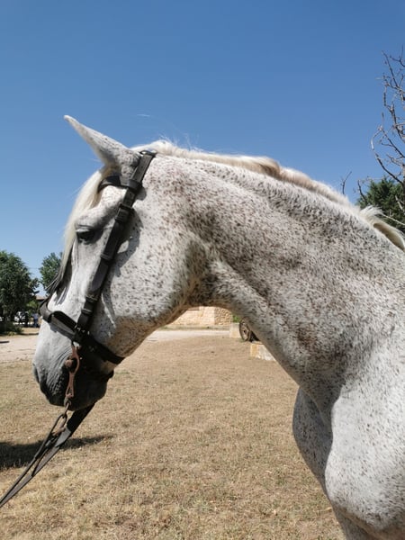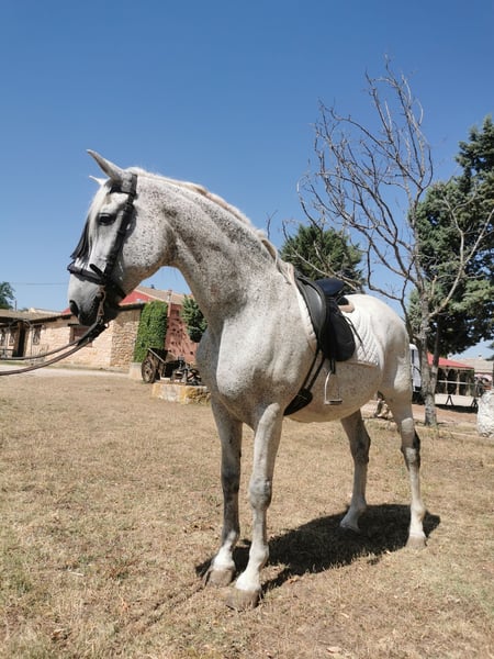 Galateo Pur cheval espagnol avec lettre Hauteur au garrot mesurée à l'hippomètre 1,65m Né en 2004 Tordo picazzo Hongre Idéal pour le terrain et la piste Il a participé à de nombreuses épreuves de toutes sortes. Très bien dressé. Bons mouvements et très à l'aise. Cessions de jambes, rentrées, traversées, renversements, appuis... Si vous avez des questions, appelez 696613777.