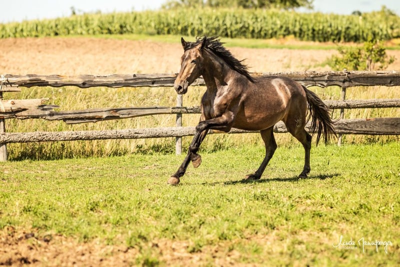 PRE Wallach, 3-jährig – barocker Typ mit Charakter & Nervenstärke Albatro ist ein ausgesprochen typvoller, sehr hübscher 3-jähriger PRE-Wallach mit feinem Charakter und guten Nerven. Er ist bereits kastriert, altersgerecht entwickelt und befindet sich noch im Wachstum. Das zu erwartende Endmaß liegt bei ca. 1,60 m. Er wird ein stabiler, barocker Vertreter seiner Rasse mit guter Substanz und harmonischem Körperbau. Albatro ist im Herdenverband auf weitläufigen Flächen mit viel Bewegung aufgewachsen und bestens sozialisiert. Aktuell lebt er in unserer „Boygroup“ zusammen mit einem Zuchthengst und zwei Jährlingen im Offenstall mit 24h Bewegungsmöglichkeit und großzügiger Koppelnutzung über den Sommer.Er kennt artgerechte Aufzucht, klare Strukturen und den täglichen Umgang. Er eignet sich ideal als zukünftiger Freizeitpartner, für barocke Reitweise oder auch für ambitionierte Freizeitreiter, die Wert auf Charakter, Typ und solide Aufzucht legen. Auf Wunsch kann Albatro gerne zur weiteren Aufzucht bei uns verbleiben oder zu einem gewissenhaften Bereiter ein paar Ortschaften weiter gebracht werden und dort eingeritten. Weitere Informationen und Bilder gerne auf Anfrage. PRE Gestüt MJ Magic Joy