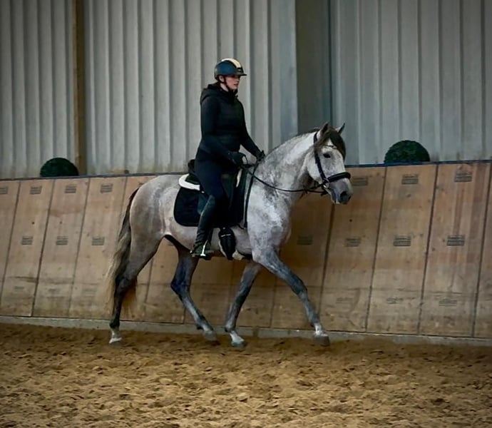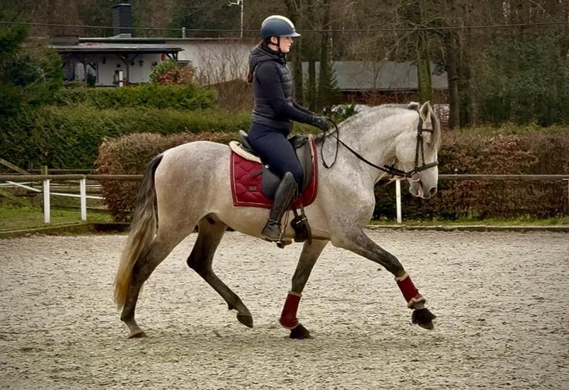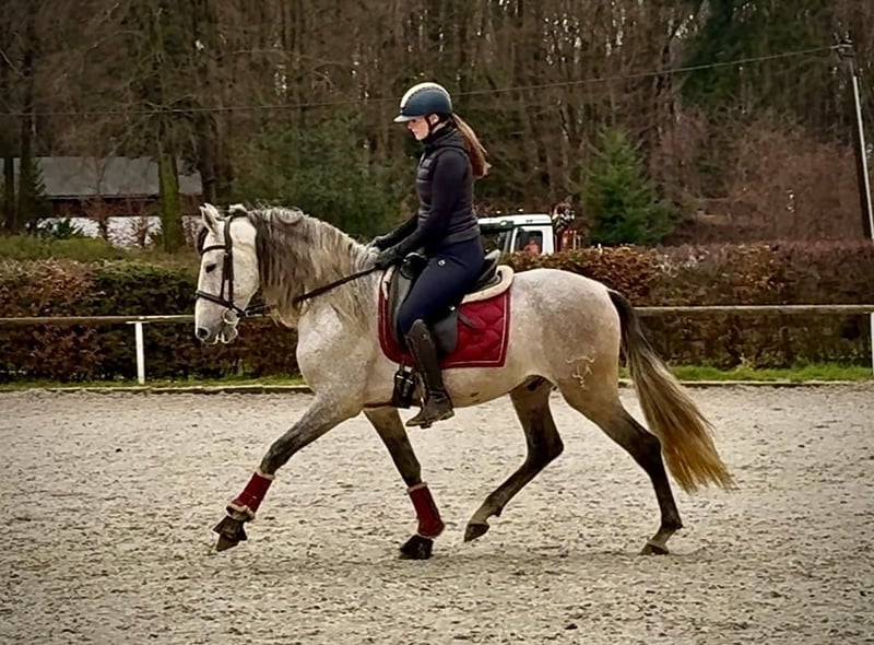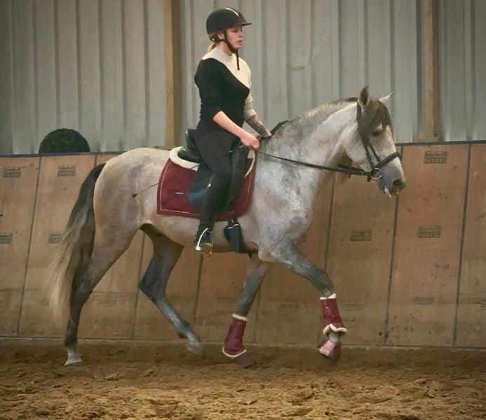 Name: Tunante De Joca Rasse: P.R.E Geschlecht: Wallach Geburtsdatum: 19.03.2021 Alter: 4 Stockmaß: 1.55m Farbe: Schimmel Abstammung: liegt vor Charakter: menschenbezogen, lernwillig, verlässlich, neugierig, intelligent Ausbildung/Eignung: geritten, Freizeit, Dressur, Working Equitation Geländeerfahrung: zuverlässig, unerschrocken, alleine und in der Gruppe Gesundheit: entwurmt, geimpft, Barhufer, ekzemfrei, Zähne kontrolliert, ostheopatisch behandelt Haltung: Box, Offenstall Besonderheiten: sehr sitzbequem, schmiede und verladefromm, herdenverträglich Die genannten Eigenschaften beruhen auf unserer persönlichen Einschätzung und stellen keine zugesicherten Merkmale dar. Preis: 6900€ (Bruttopreis) Haben wir ihr Interesse geweckt? Um Ihnen einen besseren Eindruck von Tunante zu geben, senden wir Ihnen sehr gerne sein Reitvideo zu. Selbstverständlich stehen wir Ihnen für eine ausführliche Beschreibung des Pferdes, persönliche Beratung und zur Beantwortung aller Ihrer Fragen auch telefonisch zur Verfügung. Bitte schreiben Sie uns hierfür jederzeit eine WhatsApp Nachricht, oder rufen unter folgender Telefonnummer an: +49 15119487595 Unsere Telefonzeiten sind täglich von 7:00 - 13:30 sowie ab 20:00Uhr. Wir freuen uns über Ihre Kontaktaufnahme! Eine klinische oder Röntgenologische Ankaufsuntersuchung kann gerne vom Tierarzt Ihrer Wahl durchgeführt werden. Natürlich kann Tunante sicher und komfortabel in sein neues Zuhause geliefert werden. Wir kümmern uns um alle notwendigen Vorbereitungen und den Transport, damit Ihr neues Pferd stressfrei, gut betreut, versichert und wohlbehalten im neuen Zuhause ankommt. Zurzeit präsentieren wir eine sorgfältig ausgewählte Vielfalt an Verkaufspferden. Bei uns finden Sie garantiert Ihr Traumpferd. Besuchen Sie uns auch gerne auf unserer Homepage unter: www.marvinsroyalhorses.de. Sehr geehrte Kunden, gerne stellen wir Ihnen unsere Pferde vor und führen, putzen, satteln, longieren, Bodenarbeit sowie Probereiten in der Reithalle, auf dem Platz oder im Gelände ist Ihnen möglich, um Ihr neues Familienmitglied näher kennenzulernen. Dieses kostet für ein Pferd 40€, für jedes weitere 30€ und wird beim Kauf wieder erstattet. Unsere Adresse lautet: Grube Ferdinand 50 53577 Neustadt Wied Google Maps: marvinsroyalhorses