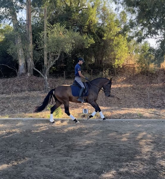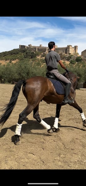 Cavallo di tipo PRE, castrato, di 7 anni, alto 1,62 m, in lavoro costante. Ottimo carattere, sicuro e tranquillo, facile nella gestione quotidiana. Esce in campagna da solo senza problemi ed è un cavallo affidabile, si lascia anche condurre al passo libero. In arena lavora correttamente passo, trotto e galoppo. Cavallo ancora in formazione, con una buona base e potenzialità per progredire nella doma. Ideale per un cavaliere amatoriale o per chi cerca un cavallo nobile da godersi e continuare a lavorare con calma. ✔️ Castrato ✔️ Senza vizi ✔️ Facile da gestire ✔️ Altri video disponibili (pista e campagna)