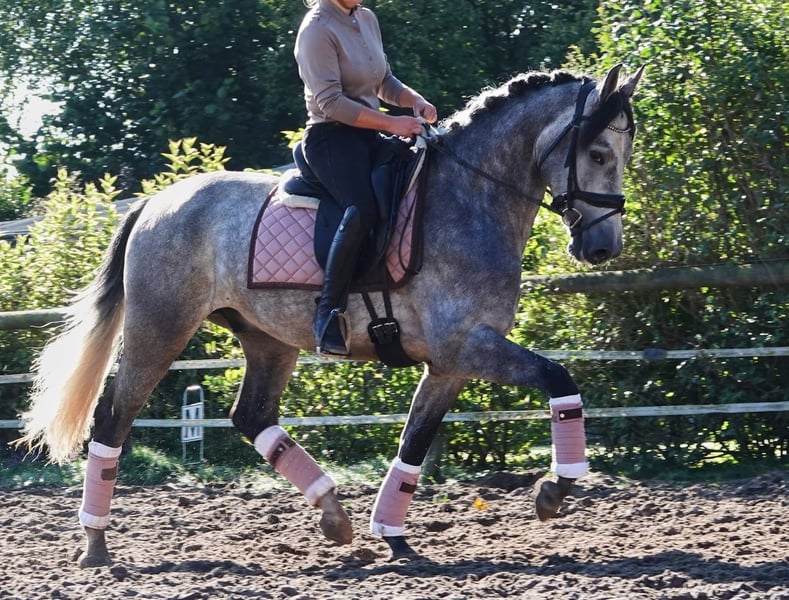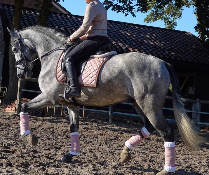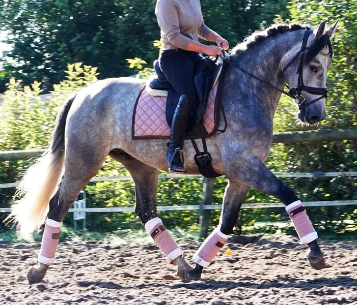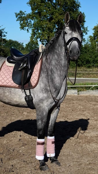 Z żalem sprzedajemy pięknego 7-letniego wałacha, PRE, o wysokości 1,65 cm. Jeźdzony na zewnątrz (samodzielnie lub pod opieką), w klasycznej ujeżdżeniu (przejazdy w kierunku barku, ugięcia, ruchy we wszystkich trzech chodach z wyraźnymi przejściami w dół i w górę: przejścia w dół i zatrzymanie na sygnał gwizdka lub dzięki nabytej postawie, ruchy boczne, kontrgalop) oraz w wolnym ujeżdżeniu. Jako regularny uczestnik dużych pokazów jeździeckich (wolne skoki) ma solidne doświadczenie w sytuacjach, które zazwyczaj wywołują strach u innych koni. Nie ma problemów z traktorami, wózkami z parasolami i innymi "wielkimi potworami", które są bardzo przerażające. Jego charyzma, obecność i piękno uczyniłyby z niego doskonałego konia pokazowego. Bardzo dobrze podróżuje i jeździ sam w przyczepie. Jest bardzo uroczy, łatwy do prowadzenia i bliski ludziom. Potrzebuje uwagi, miłości i doświadczonego jeźdźca, któremu może zaufać. Mieszka z towarzyszem w luźnej stajni na padoku zimą i na pastwisku latem. Ciekawscy i marzyciele, trzymajcie się z daleka. Jeśli masz jakiekolwiek pytania dotyczące tego przystojniaka, śmiało wyślij mi wiadomość prywatną.