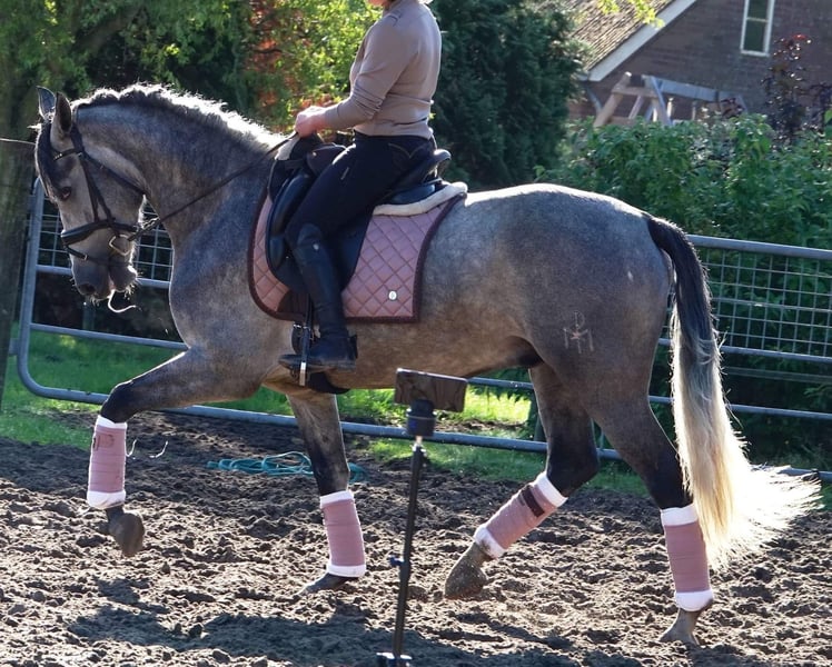 Met tegenzin verkopen wij een prachtige 7-jarige ruin, PRE. 1,65cm. Buiten gereden (alleen of onder begeleiding), in klassieke dressuur (schouderbinnenwaarts, buiging, bewegingen in alle 3 de gangen met duidelijke op- en neerwaartse overgangen: Neerwaartse overgangen en halthouden op fluitsignaal of dankzij de verworven houding, zijwaartse bewegingen, contragalop) en in vrije joering. Als regelmatige deelnemer aan grote ruitershows (vrijspringen) heeft hij een solide ervaring in situaties die normaal gesproken angst oproepen bij andere paarden. Geen zorgen met tractoren, parapluwagens en andere 'grote monsters', die erg eng zijn. Zijn charisma, aanwezigheid en schoonheid zouden van hem een uitstekend showpaard maken. Reist heel goed en rijdt alleen in de wagen. Hij is heel innemend, makkelijk aan te lijnen en dicht bij mensen. Hij heeft aandacht, liefde en een ervaren ruiter nodig op wie hij kan vertrouwen. Hij leeft met een metgezel in een losse stal op een paddock in de winter en weide in de zomer. Nieuwsgierigen en dromers, onthoud je. Moest je nog vragen hebben over deze knapperd, stuur me gerust een pm.
