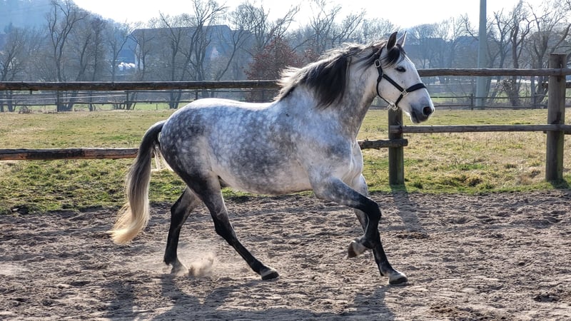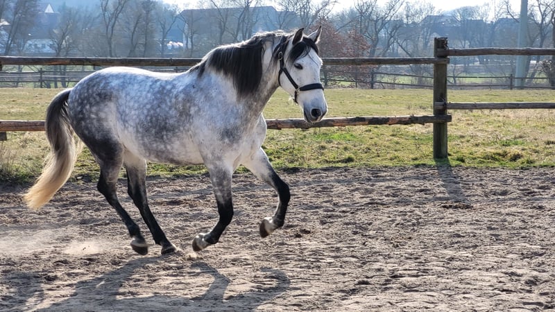 Gitano jest 8-letnim ogierkiem PRE, który wyróżnia się szczerym charakterem, niezawodnością i dużym przywiązaniem do ludzi. Jest na solidnym poziomie E-A w ujeżdżeniu, zawsze wykazuje dobrą postawę i chęć do nauki. Zna również małe skoki i pokonuje je odważnie. W obsłudze jest pewny i klarowny, bardzo przywiązany do ludzi. Ze względu na swoje dominujące usposobienie, poszukuje spokojnego, konsekwentnego jeźdźca, który zapewni mu bezpieczeństwo i strukturę – wtedy jest absolutnie niezawodnym partnerem. Zna halę i plac treningowy, chętnie współpracuje i pod siodłem jest szczery oraz bardzo zaangażowany. Również w terenie zachowuje się pewnie. Gitano szuka domu w systemie otwartego lub aktywnego stajni, w stadzie wyłącznie z wałachami. Od około roku porusza się na boku bez obciążenia, jest regularnie szczepiony i odrobaczany. Ze względu na wzrost około 1,60 m, Gitano nie jest koniem ciężarowym. Gitano jest sprzedawany znacznie poniżej wartości z powodu nagromadzenia tkanki na ramieniu (nie wpływa to na jego funkcjonowanie). Chętnie udzielę więcej informacji przez wiadomość prywatną. Nie jest to sprzedaż pilna! Priorytetem jest dla nas dobre miejsce dla konia. Gitano oddajemy tylko w najlepsze ręce! Bez pośredników i szkół jeździeckich.