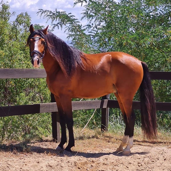 Age: 7 years Height: 165 cm Color: Beautiful brown with blaze Type: Baroque type Sovereign & easy to handle Our magnificent gelding is not only an eye-catcher, but also a dream to handle! It is confident and easy to handle, which makes it the ideal partner for leisure or sports. With his prime age of 7 years, he is very well-behaved and ready to experience many beautiful moments with his new owner. Versatile & Sporty Whether for relaxed rides in nature or for sporting activities - this gelding is suitable for both! His breed, Pura Raza Española, is known for its versatility, elegance and willingness to perform, and our gelding is no exception.
