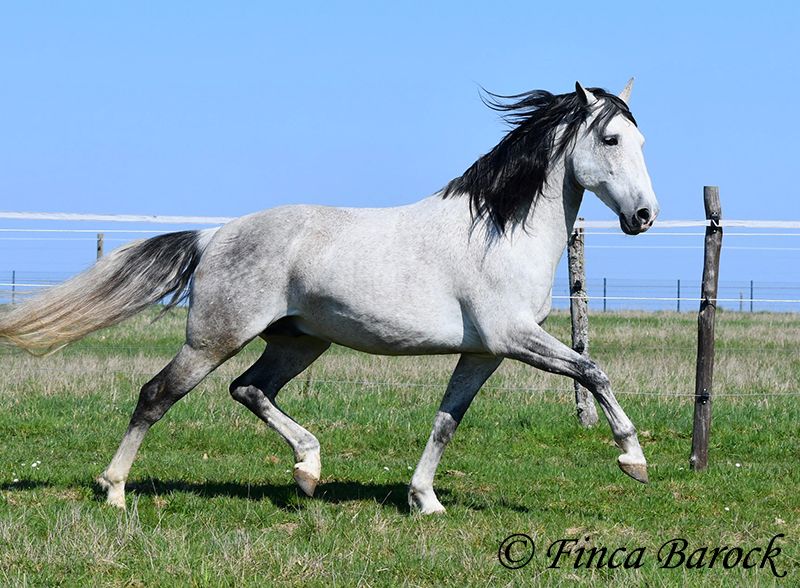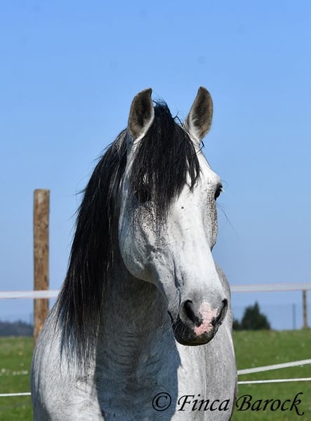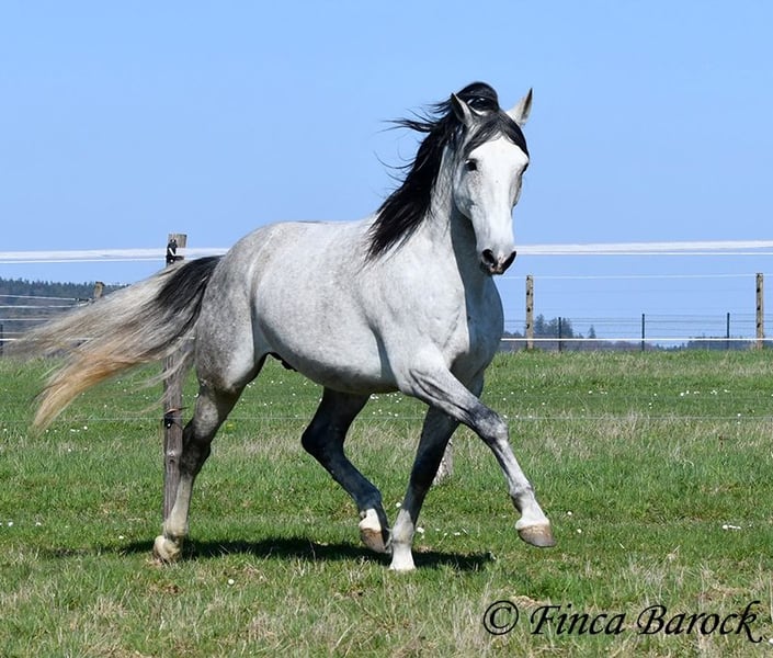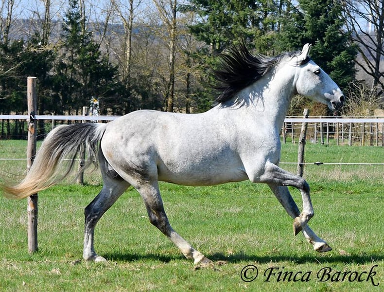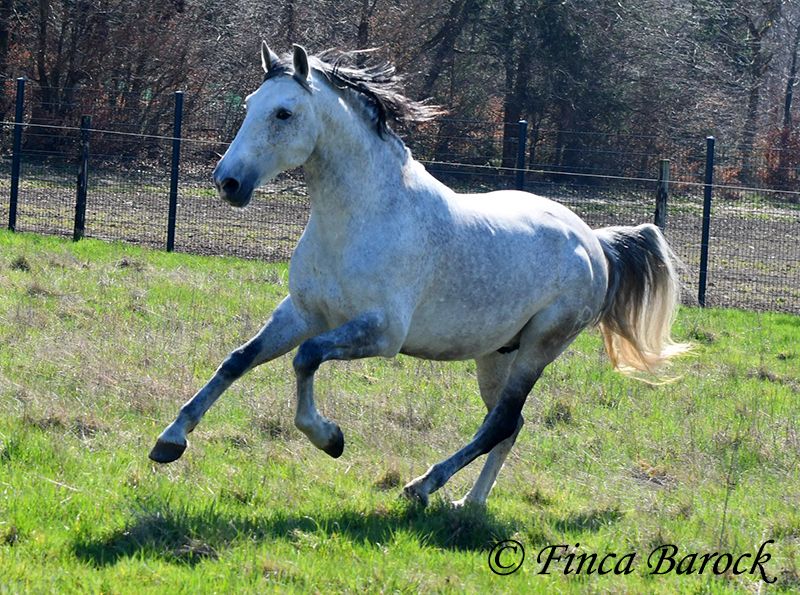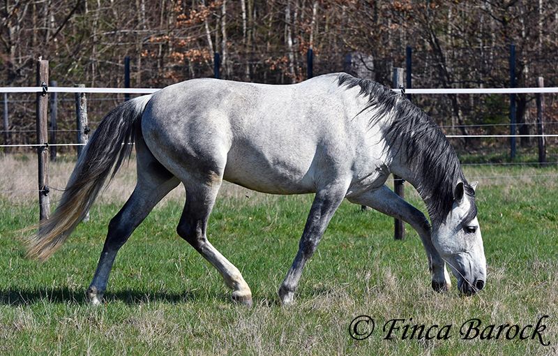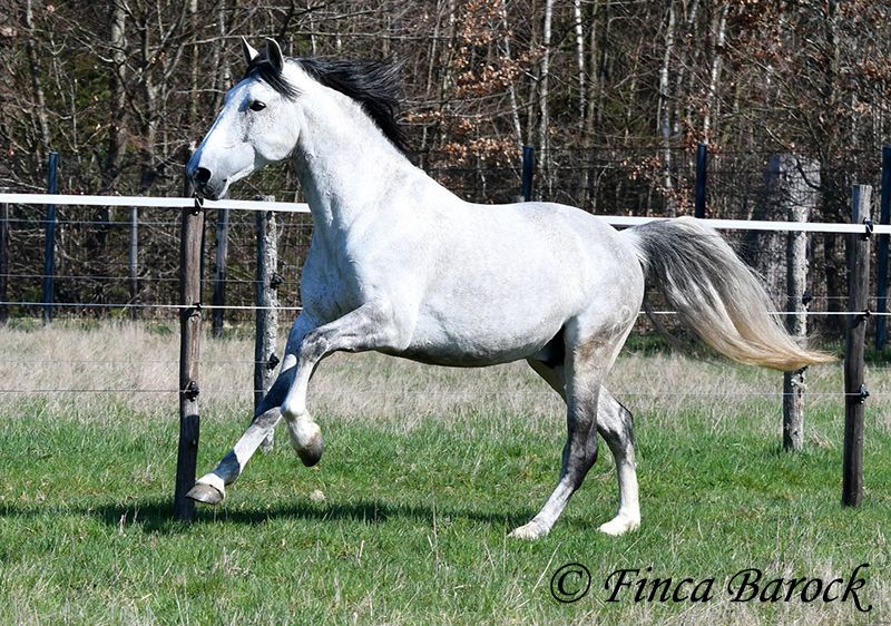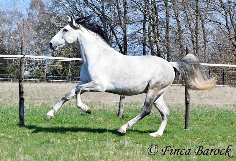 Rasse: PRE Name: Capitan RV Geschlecht: Hengst Stockmaß: 165 cm Alter: 08.09.2017 Farbe: Schimmel Preis: 17.000 € Vater: Junco DP (Calificado) v. Duque CXIII (Calificado, Mejorante und Elite!) Mutter: Ladina VII v. Jugueton IV Capitan ist ein imposanter Hengst mit freundlichem Wesen und solider Ausbildung. Er kennt sehr viel Bodenarbeit und Arbeit an der Hand. Capitan reagiert hier fein und auf leichte Hilfen. Schulterherein, Travers, Renvers, Traversale macht er an der Hand sehr souverän. Ebenso zeigt er einen schönen Spanischen Schritt an der Hand. Auch das Einparken an die Aufstiegshilfe klappt wunderbar. Unter dem Reiter sind die Seitengänge im Schritt schon gut gefestigt und im Trab werden sie immer besser. Capitan hat eine tolle Bergaufgaloppade welche dem Reiter sofort ein Lächeln ins Gesicht zaubert. Er wurde mit Ruhe ausgebildet und hat Zeit zum reifen bekommen. Gelände kennt er viel und freut sich mit seinem Reiter durch das Gelände zu streifen. In der Freiarbeit ist Capitan ebenso mit viel Elan und Freude dabei. Er ist sehr Personenbezogen. Capitan ist gekört und hat auch bereits Nachzucht. Er hat die Elitehengste Duque CXIII und Educado X in seinem Pedigree. Sein Papa Junco DP ist ein Calificadohengst. Es befindet sich einiges an Cartujanoblut in seiner Abstammung. Im letzten Jahr hat er nicht gedeckt und zeigt insgesamt fast keine Hengstmanieren. Es steht bei uns in der Stallgasse mit Stuten und Wallachen. Er ist der Weitergang mit anderen Wallachen gewöhnt. Er wird von privat als gesundheitlichen Gründen abgegeben. Er hat eine klinische Untersuchung und Röntgenbilder. Kontakt: Finca Barock, Tel. 0173-696 31 81, 56291 Wiebelsheim