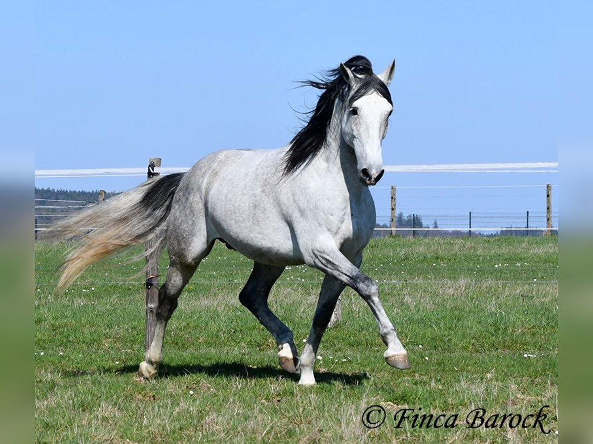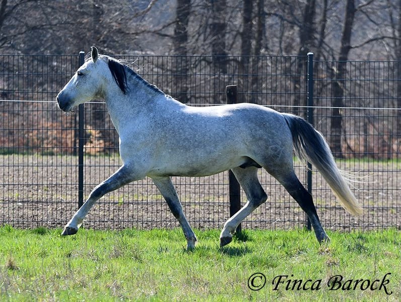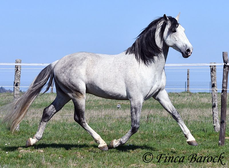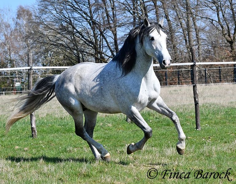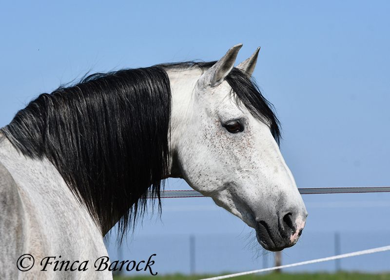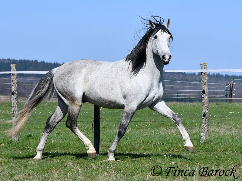 Rasse: PRE Name: Capitan RV Geschlecht: Hengst Stockmaß: 165 cm Alter: 08.09.2017 Farbe: Schimmel Preis: 17.000 € Vater: Junco DP (Calificado) v. Duque CXIII (Calificado, Mejorante und Elite!) Mutter: Ladina VII v. Jugueton IV Capitan ist ein imposanter Hengst mit freundlichem Wesen und solider Ausbildung. Er kennt sehr viel Bodenarbeit und Arbeit an der Hand. Capitan reagiert hier fein und auf leichte Hilfen. Schulterherein, Travers, Renvers, Traversale macht er an der Hand sehr souverän. Ebenso zeigt er einen schönen Spanischen Schritt an der Hand. Auch das Einparken an die Aufstiegshilfe klappt wunderbar. Unter dem Reiter sind die Seitengänge im Schritt schon gut gefestigt und im Trab werden sie immer besser. Capitan hat eine tolle Bergaufgaloppade welche dem Reiter sofort ein Lächeln ins Gesicht zaubert. Er wurde mit Ruhe ausgebildet und hat Zeit zum reifen bekommen. Gelände kennt er viel und freut sich mit seinem Reiter durch das Gelände zu streifen. In der Freiarbeit ist Capitan ebenso mit viel Elan und Freude dabei. Er ist sehr Personenbezogen. Capitan ist gekört und hat auch bereits Nachzucht. Er hat die Elitehengste Duque CXIII und Educado X in seinem Pedigree. Sein Papa Junco DP ist ein Calificadohengst. Es befindet sich einiges an Cartujanoblut in seiner Abstammung. Im letzten Jahr hat er nicht gedeckt und zeigt insgesamt fast keine Hengstmanieren. Es steht bei uns in der Stallgasse mit Stuten und Wallachen. Er ist der Weitergang mit anderen Wallachen gewöhnt. Er wird von privat als gesundheitlichen Gründen abgegeben. Er hat eine klinische Untersuchung und Röntgenbilder. Kontakt: Finca Barock, Tel. 0173-696 31 81, 56291 Wiebelsheim