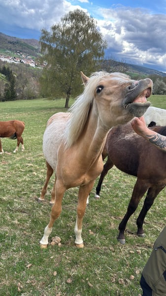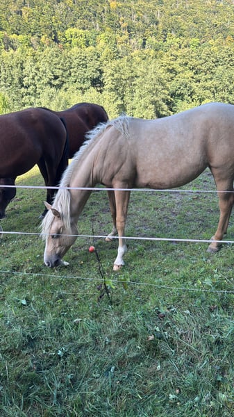 Aus persönlichen Gründen biete ich meine liebevolle, zweijährige Palomino Stute zum Verkauf an. Miley wächst artgerecht im Herdenverband auf und zeigt sich dabei sehr sozial, neugierig und menschenbezogen. Sie wird voraussichtlich ein Stockmaß von ca. 155 cm erreichen. Mutter und Vater können beide vor Ort am Stall besichtigt werden. ✨ Eckdaten & Ausbildung: • Geboren am 20.04.2024 • Farbe: Palomino • Endmaß ca. 155 cm • Aufgewachsen im Herdenverband • Kennt Hunde, Katzen, Traktoren & Kinder • Beherrscht das Fohlen-ABC • Anhängerfahren gewohnt • Regelmäßig beim Hufschmied vorgestellt • Regelmäßig geimpft & entwurmt Sie ist altersgerecht erzogen, brav im Umgang und zeigt ein ausgeglichenes, freundliches Wesen. Damit eignet sie sich ideal als zukünftiges Freizeit- oder Reitpferd für liebevolle Hände.