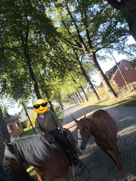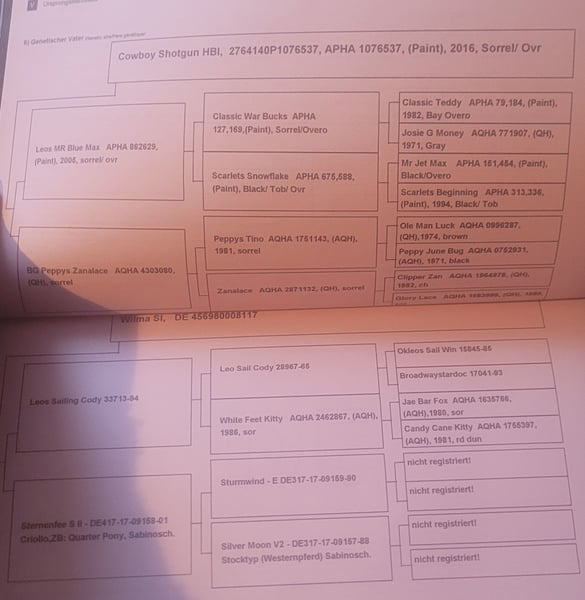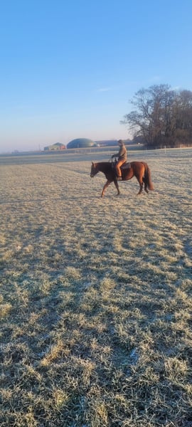 Wanda ist eine wunderschöne absolut gesunde Stute in der Farbe sorel. Sie wurde im Februar 5 Jahre alt und hat ein Stockmaß von 1,45 m. Sie ist angeritten. Sie ist immer motiviert, kommt auf Zuruf angerannt oder wiehert sobald sie uns sieht. Sie kennt Hunde, Katzen, Enten, Hühner, Strassen, Trecker und Kinder. Achso und da wir auch Rinder haben und sie mit denen eine zeitlang zusammen stand, würde sie sich auch super für die Arbeit am Rind eignen! In ihrer Abstammung zeigen sich Criollo, Quarter Horse und Paint, was nochmal für ihre Arbeitsfreude, Nervenstärke und Zuverlässigkeit spricht. Sie zeigt keinerlei Unarten! Sie geht auch im Gallopp als Handpferd mit. Immer artig, kein Durchgänger oder Buckler etc. ! Im Winter sind wir mit allen Pferden, Schlitten, Kindern und Hunden los. Alles etwas chaotisch und sie blieb total artig. Wir nehmen Sie oft als Handpferd mit ins Gelände. In der Ausbildung zum Reitpferd zeigt sie sich extrem gelassen und will alles richtig machen. Sie ist eine richtig coole Socke. Sie ist super gelehrig und absolut nicht schreckhaft. Sattel, gebissloses Zaumzeug und Reitergewicht im Schritt und Trab kennt sie, auch im Gelände. Bisher sind wir ein paar mal für 1 Std mit ihr ausgeritten. Natürlich kennt sie auch die regelmäßige Hufpflege. Sie hat das Glück, dass ihr Mörchengeber Huforthopäde ist. Und auch auf den Hänger ist sie super gegangen (1× zu uns). Laut Vorbesitzerin ist sie grundimmunisiert. Sie läuft barhuf und kennt bei uns Offenstall, Weide im Sommer und 24/7 Heu. Sie steht bei uns mit 1 Wallach und 2 Stuten zusammen und ist mittig im Rang. Der Verkauf fällt uns echt schwer, da sie ein tolles Reitpferd ist. Wir aber einfach zu wenig Zeit haben und nur sporadisch mal ausreiten wollen. Dafür ist sie viel zu schade. Wir wünschen uns für Sie Jemanden, der sie weiter ausbildet und reitet und ihr Liebe und Aufmerksamkeit schenkt. Sie sollte artgerecht gehalten werden, was 24 Std Box ausschließt. Sie hat volle Papiere ! Platz vor Preis! Kein Notverkauf. VB 5900 €