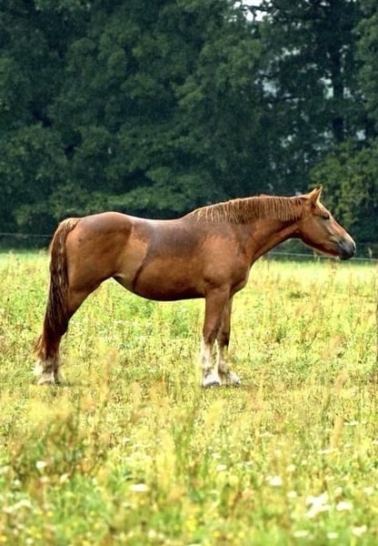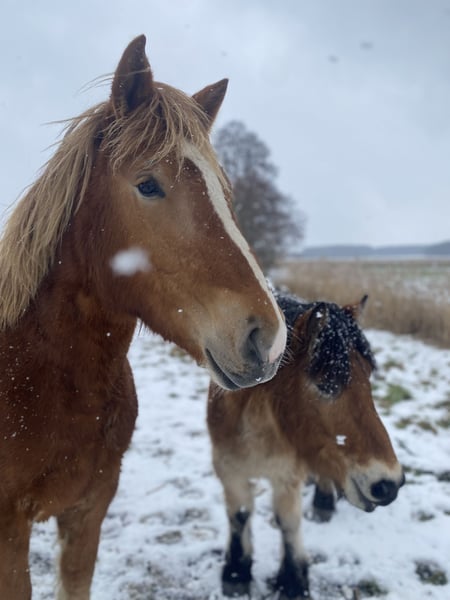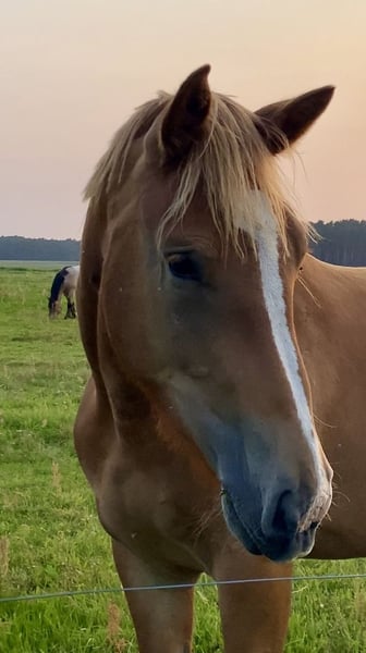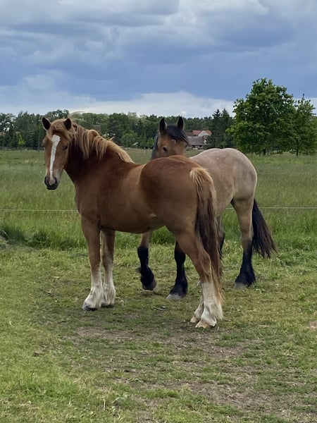 Svala ist eine fast 3-jährige Rheinisch-Deutsche Kaltblutstute (PSSM1 frei) und entstammt einer Antonio x Orloff Mutter. Der Vater ist Conrad v. Brück (bis M platziert). Diese schöne Jungstute in auffälliger Dunkelfuchsjacke mit großem Auge und sportlichem Körperbau ist dem Menschen sehr zugewandt, aufmerksam und verschmust. Svala wächst im altersgemischten Herdenverband auf und ist weder die ranghöchste noch rangniedrigste Stute. Sie besitzt volle Papiere, ist gechippt und wird regelmäßig entwurmt, geimpft sowie dem Schmied vorgestellt und kennt das Verladen mit Anhänger und LKW. Sie passt aufgrund ihrer Farbe leider nicht in unsere Gespanne und sucht ab demnächst ein neues Zuhause.