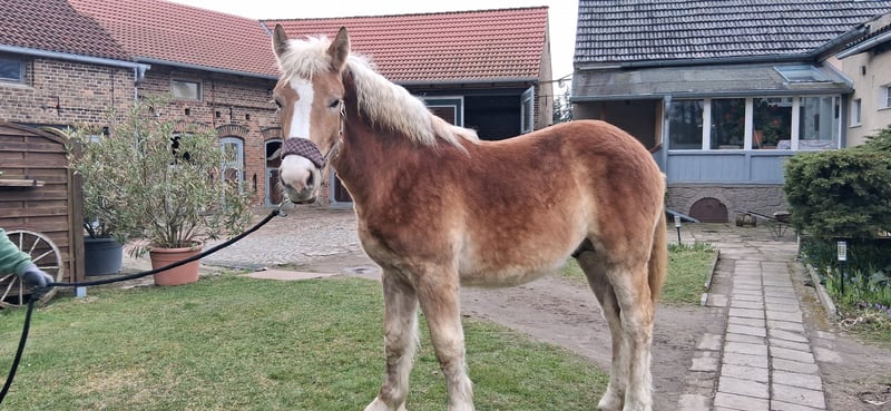 Zum Verkauf steht unser typvoller rh.dt. Kaltblut-Jährlings-Wallach in der Farbe Fuchs mit hellem Behang und einer sehr schönen Doppelmähne. Ural überzeugt durch seine guten Grundgangarten, einem korrektem Fundament sowie durch seine aufgeschlossene, dem Menschen zugewandte Art. Vater ist der Landbeschäler des Landgestütes Moritzburg, Urmel, Bundesreservesieger 2017. Ural kennt selbstverständlich das Fohlen-ABC, ist halfterführig, wird regelmäßig dem Hufschmied vorgestellt, geht brav auf den Pferdeanhänger, ist mehrfach entwurmt und geimpft. PSSM-Status: n/n (über die Eltern)