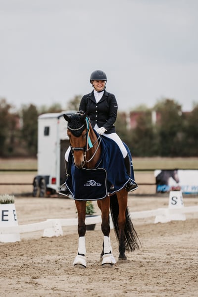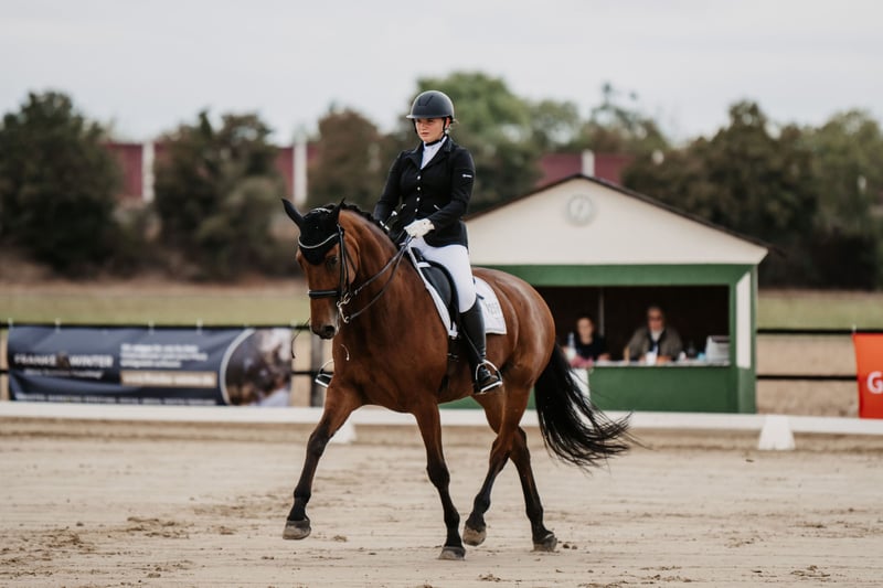 Questa si tratta di una femmina nata nel 2013. Si distingue per il suo carattere molto equilibrato, le sue andature di base molto comode e un'eccellente maneggevolezza. Per questo motivo è adatta anche a cavalieri meno esperti, anche se, a causa del suo livello di addestramento, non è una cavalla da principianti. Va molto bene al passo da sola, ma anche in compagnia, e si fa condurre facilmente in passeggiata, mostrando sempre calma e coraggio. È sempre entusiasta di partecipare ad attività divertenti come l’addestramento a spavento. L’ho portata io stessa in gara dalla prima prova di dressage A fino alla classe M. L’ultima volta è stata in gara ad aprile 2025, dove ha ottenuto il quinto posto in una M*. Trovare per lei una buona sistemazione è sicuramente la priorità.