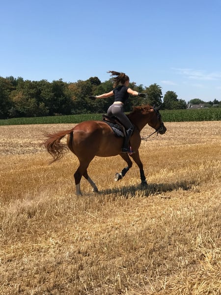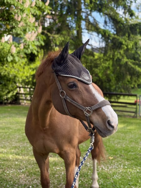 Ich biete hier meine liebenswerte Rheinländer-Stute Riva an. Riva ist ein echtes Herzenspferd mit ruhigem, freundlichem Charakter und viel Lebenserfahrung. Sie wurde früher in Dressur bis L, Springen bis E und Vielseitigkeit bis L ausgebildet. Seit rund drei Jahren wird sie jedoch nur noch freizeitmäßig und überwiegend im Gelände geritten. Riva kennt wirklich alles – Straße, Verkehr, Hunde, allein oder in der Gruppe – und macht alles brav mit. Sie wurde von mir zeitweise sogar mit Halfter oder Halsring, auch im Gelände, geritten. Man merkt ihr das Alter kaum an – sie kann auch mal verspielt sein, aber immer auf eine liebe Art. Charakter • sehr lieb, menschenbezogen und aufgeblüht • zuverlässig im Umgang, auch mit Kindern • kennt Kinder & unerfahrene Reiter und war immer brav • typische Stute: ab und zu testet sie einen Reiter gern mal 😉 (z. B. heute ist eine Pfütze okay – morgen ist sie gruselig) Hufe & Gesundheit • Barhuferin (keine Eisen) – Hufe wurden stets regelmäßig kontrolliert und gepflegt • In all den Jahren bei mir hatte sie nur zwei Sehnenentzündungen (einmal vorne, einmal hinten) • abgesehen davon keinerlei gesundheitliche Probleme während meiner gesamten Besitzzeit (Ehrlichkeit ist mir wichtig – sie soll in ein passendes, langfristiges Zuhause kommen.) Riva war früher mit den Vorbesitzern auch auf Turnieren unterwegs, ist aber seit ca. 11–12 Jahren nicht mehr gestartet. 📍 Standort: Dormagen 📄 Abstammung: kann ergänzt werden Ein liebevolles Zuhause mit Herz und Pferdeverstand ist mir sehr wichtig. Mein Wunsch wäre, dass sie ein endgültiges Zuhause findet. Ich persönlich würde mich wahnsinnig darüber freuen wenn ich sie in ihrem neuen Zuhause auch nochmal besuchen kommen dürfte. Probereiten und Kennenlernen nach Absprache möglich.