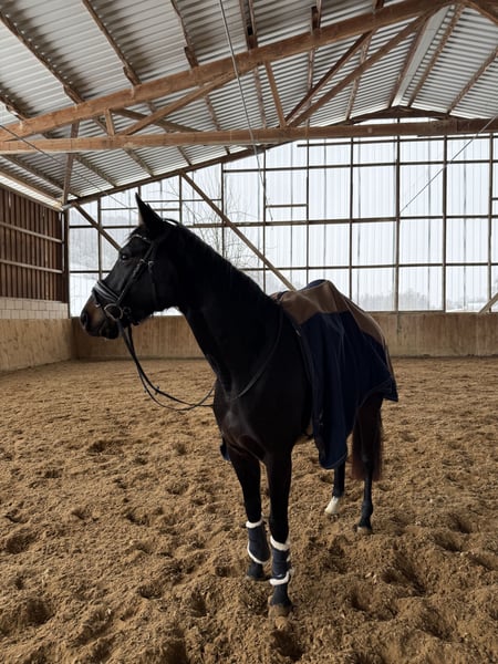 Elli est une jument hanovrienne de 4 ans issue directement du sang de V.d. Decken. Elle se distingue par sa grande facilité à monter, sa beauté et sa conformité, avec trois très bonnes allures naturelles. Elle possède également un très agréable tempérament, est très fine à la selle et légère en main, ce qui rend chaque séance d'entraînement simplement plaisante. Elli est parfaitement lucide et apprend très rapidement. Elle convient donc également parfaitement comme cheval pour jeunes cavaliers. Elle a été dressée de manière polyvalente et se montre détendue en groupe ou en solo lors des sorties en extérieur. Lors de ses premiers sauts sous la selle, elle a également montré beaucoup de talent, d’engagement et de plaisir. Elle vient directement du naisseur et a été élevée de manière conforme à ses besoins au sein d’un troupeau, ce qui en fait une jument très bien socialisée. — Eckhardt x Granikos x Sherwood — 1,62 m (16.1 hh) — 4 ans — Dressage A terminé — Non ferrée — En bonne santé (6 radiographies récentes sans anomalies disponibles) ‼️ Pour toute réelle intention, merci de me contacter au 0171/8353415 ‼️