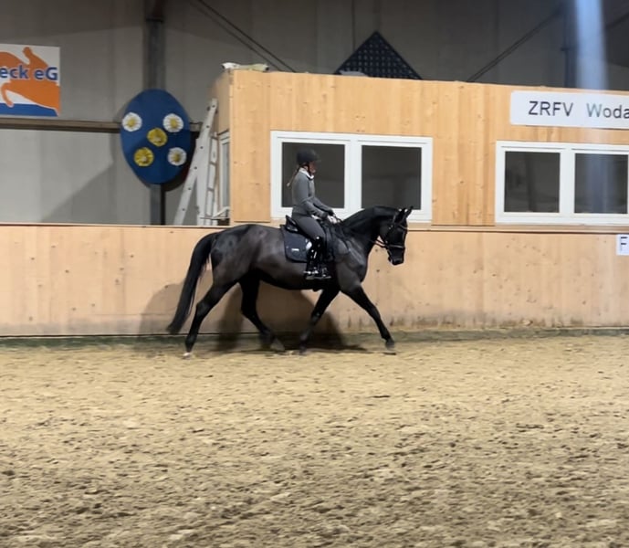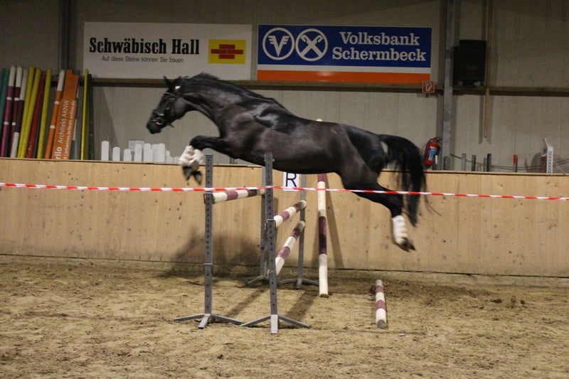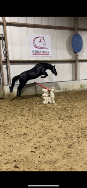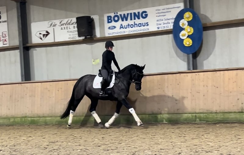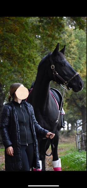 For sale is my beautiful jet-black mare, Feengold, a daughter of For Gold x Giacomo v. Grannus. After careful consideration, I have made the difficult decision to place my mare Feengold into caring and supportive hands. Feengold stands at 16.1 hh and was foaled in 2018. She was backed about a year ago and is still relatively untouched, having been allowed to mature calmly. She is well-started and is continuously developing in a harmonious manner. She always appears motivated, attentive, and eager to learn. Due to her pedigree, she is also of interest for breeding purposes. Her training so far has focused mainly on dressage, where she currently confidently performs at elementary level. Basic lateral work, especially the leg-yield, has already been introduced in training. Feengold also shows great talent for jumping; she is straightforward, easy to handle, and well-balanced over fences. She approaches jumps honestly, reliably wants to get to the other side, and clearly enjoys her work. She never refuses and always strives to do her best. This makes her versatile and suitable for other disciplines as well, such as eventing or cross-discipline training. I am looking for a rider with a solid riding foundation who can give her clear aids and further develop her. She is also well-suited for ambitious young riders, provided they have competent support from a trainer or experienced parents. Feengold has been carefully cared for at all times: her teeth were last checked in April this year, and she has regularly received physiotherapy and osteopathic treatments. In early December, a comprehensive blood test was performed, showing no abnormalities, and can be viewed upon request. She is barefoot and has not needed shoes so far due to her good hooves. Matching equipment can be purchased additionally if desired; her saddle was recently refitted in May. Please feel free to contact me at any time with further questions. Serious inquiries only.