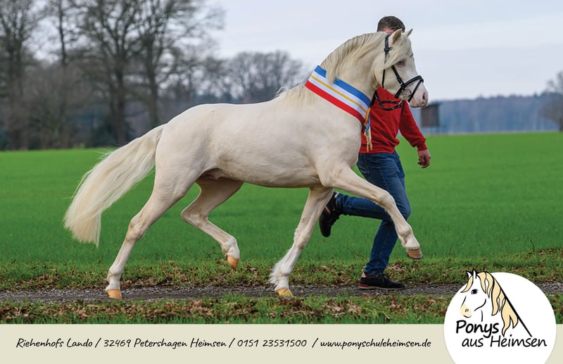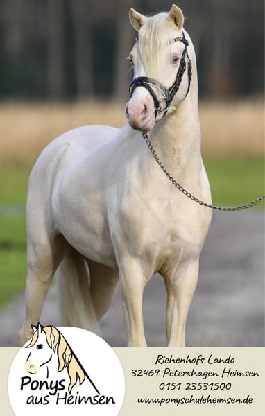 Riehenhofs Lando - Ponys aus Heimsen Mit enormen Bewegungspotential ausgestattet, faszinierte er in allen Belangen und wurde als Prämienhengst und zweiter Reservesieger der Körung in Redefin auf dem Endring herausgestellt. So überzeugte der Prämienhengst als Reservesieger auf seiner HLP in Offenbüttel mit einer sagenhaften 8,85. Jeden Tag sind wir aufs neue begeistert und werden bei seinem Anblick niemals müde - seine Ausstrahlung und Eleganz ziehen sofort in seinen Bann - ein Pony für alle Fäll und das große Viereck! Mit bester Abstammung gibt Lando seinen unverwechselbaren Welsh-Typ und freundliches Wesen sicher an seine Nachkommen weiter - und das in Sonderfarbe! Seine Arbeitseinstellung und Gutmütigkeit in der täglichen Arbeit, vorm Wagen und unter dem Sattel machen das Training mit ihm zu einer wahren Freude und sind das aller wichtigste für eine nervenstarke und leistungsbereite Pony-Nachzucht. Seine ersten beiden Fohlenjahrgänge waren hoch erfolgreiche Prämien- und Siegerfohlen und überzeugten auf ganzer Linie Richter, Züchter und Besitzer. Riehenhofs Lando stammt ab vom hoch erfolgreichen Prämien- und Leistungshengst Woldberg‘s Leonardi, der 2023 bei der FN-Bundeshengstschau auf der Grünen Woche in Berlin zum Bundes-Reservesieger im Schauwettbewerb der Welsh Ponys (Sektion B) gekürt wurde und die FN-Bundesprämie erhielt. Der Muttervater Timing, selbst ein Sohn des Vierspänner-Weltmeisters Tizian/Tobias Bücker, absolvierte seine HLP 2007 in Thüle mit 8,63 als Sieger, nahm dreimal an Weltmeisterschaften teil und verbuchte zahlreiche weitere internationale Siege und Platzierungen. Die Mutter Verb.Pr.St. Ella brachte noch die St.Pr.A. Riehenhofs Elba (v. Nilanthoeve‘s Zippo), die 2021 für die Elitestutenschau Weser-Ems in Hude-Wüsting zugelassen war. Mit diesem Hengst bieten wir den Garant für die Zucht von bewegungsstarken und zuverlässigen Kinder-, Dressur- und Fahrponys. Überzeugt Euch von unserem tollen Hengst für Eure Zuchtstuten! - Anerkannt für Westfalen, Weser-Ems und Hannover - Farbe Cremello (Farbgentest: A/a, Cr/Cr, e/e) - CA-frei, PSSM-frei - Unterbringung der Gaststuten im Offenstall, Ausbildung und Beritt zeitgleich möglich www.ponysausheimsen.de 015123531500