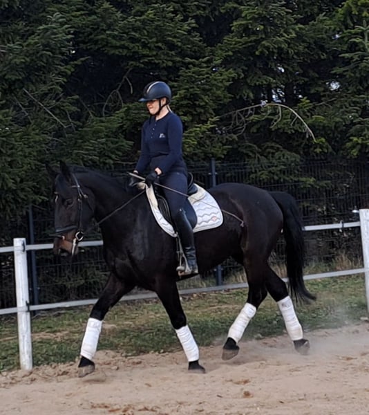 Afrodyta – Schlesian mare with full pedigree and main studbook registration 4 years old, 16.1 hh (168 cm) tall. She is a beautiful Schlesian mare, born in 2022. With her elegant dark coat and a height of 168 cm, she is not only a striking appearance but also a lovely dressage horse. She is also trained to drive and has been driven in a two-in-hand. This mare is characterized by her friendly and outgoing nature. She is well-behaved, easy to handle, and familiar with dogs and cats. Her movements are supple and expressive. A great leisure horse. The mare is healthy, barefoot, and herd-friendly. If you are interested or have further questions, please feel free to contact me. Visits and trial rides are possible by arrangement.