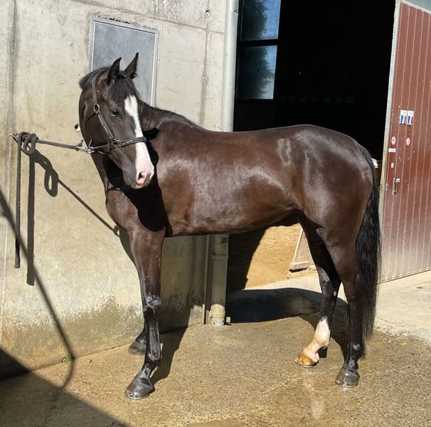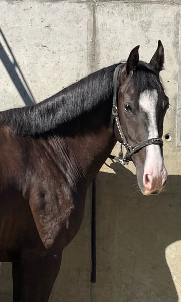Wunderschöne, dunkelbraune Schweizer Warmblut-Stute, geborene im Jahr 2021. Sie überzeugt mit ihrem modernen Exterieur und mit ihrem Charakter. Sie zeigt sich im täglichen Umgang wie auch unter dem Sattel stets brav, aufmerksam und lernwillig. Bereits solide angeritten, präsentiert sie sich in der Dressurarbeit gut ausbalanciert und sicher in den Grundgangarten. Auch im Gelände zeigt sie sich zuverlässig. Im Springen hat sie bereits kleine Parcours souverän gemeistert und zeigt dabei Vermögen, Technik sowie eine tolle Einstellung. Ein ideales Nachwuchspferd für Reiter, die sich eine unkomplizierte, gut ausgebildete junge Stute mit Potenzial wünschen. Bei Interesse stehe ich gerne für weitere Informationen und eine Besichtigung zur Verfügung.