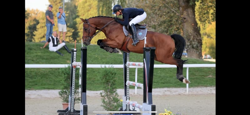 Umour ist ein lustiger, liebenswerter Wallach Er wurde sorgfältig ausgebildet (keine Schnellbleiche), und er brauchte diese Zeit auch, da er als junges Pferd sehr charakterstark war. Seine Mutter ist bis GP/Nationenpreise erfolgreich gewesen, wie auch sein Vater Urano de Cartigny. Derzeit ist er bis Prüfungen 135 cm sicher unterwegs. Er ist auch schon über 140 mit 0 gesprungen, höher jedoch ist noch über seiner Komfortzone. Der Wallach ist im Alltag eher bequem und etwas faul, aber fein zu reiten. Im Gelände ganz brav. Im Parcours kann er auch mal frisch und stark sein, will immer rüber, und hat eine gute Grundvorsicht, jedoch nicht ängstlich und verzeiht auch mal einen Fehler. Im Umgang ist er sehr verschmust und sehr brav, will aber immer, dass man ihm seine Aufmerksamkeit schenkt;>), und dies macht er auch mal mit lustigem Schabernack. Im Exterieur ist Umour eher quadratisch, hat einen kurzen Hals, weich zu sitzende Bewegungen. Umour ist kein Anfängerpferd, da er doch mal austesten kann, wer der Chef sein will. Er ist aber durch seine kompakte Art und sein reaktives Springen sicher ein Pferd, mit dem ein Amateur bis Kat. 130/135 Freude haben kann.