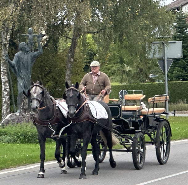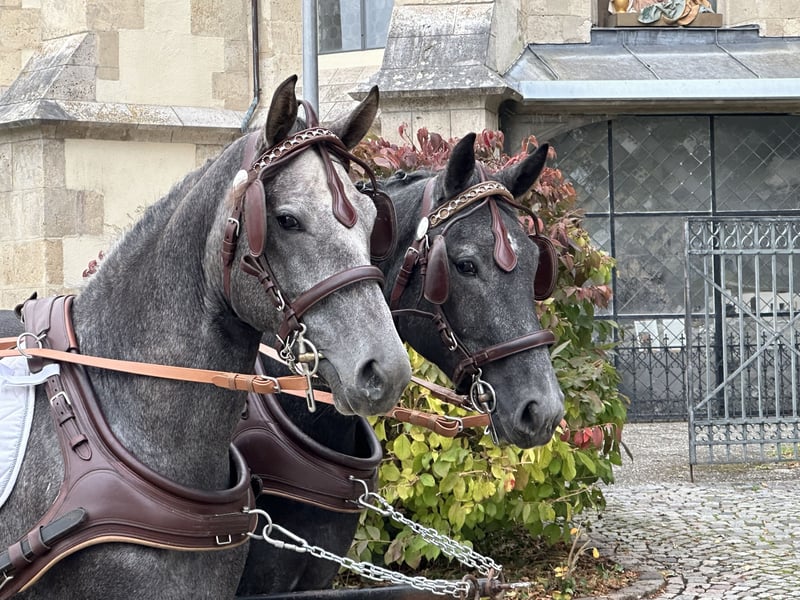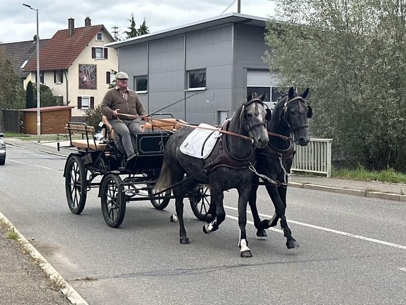 Sehr ansprechendes und gut harmonierendes Gespann (Wallach links Stute rechts ) das straßensicher gefahren ist . Beide Pferde sind auch einspännig gefahren sowie im Gelände und in der Halle geritten.