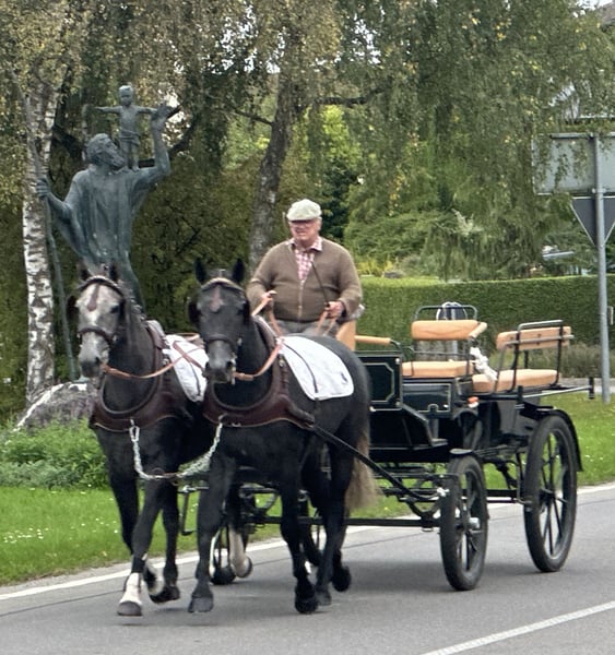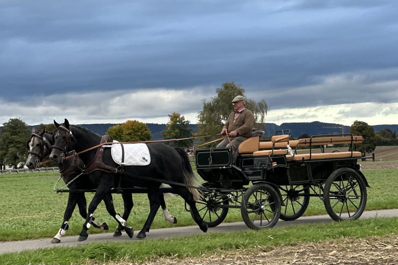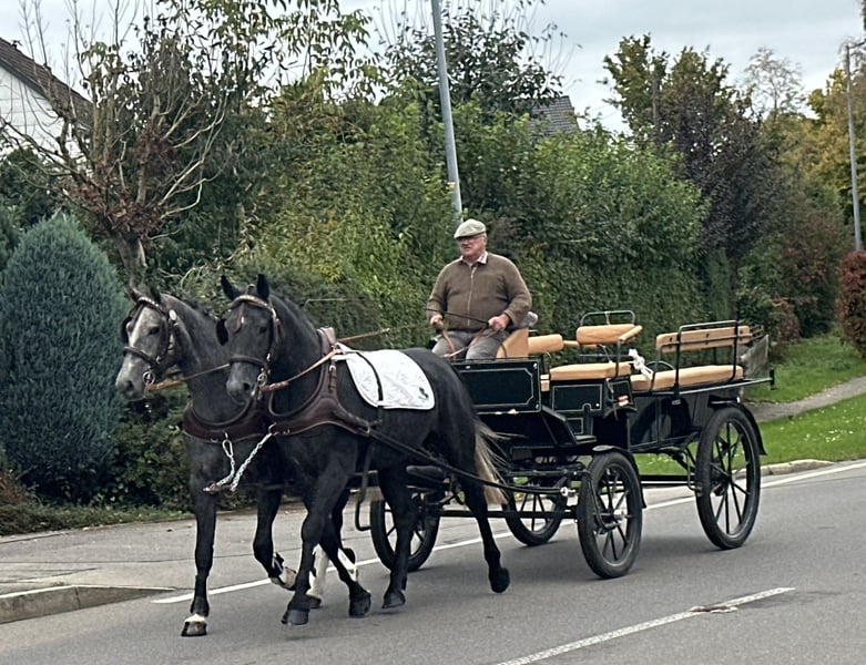 Sehr ansprechendes und gut harmonierendes Gespann (Wallach links Stute rechts ) das straßensicher gefahren ist . Beide Pferde sind auch einspännig gefahren sowie im Gelände und in der Halle geritten.