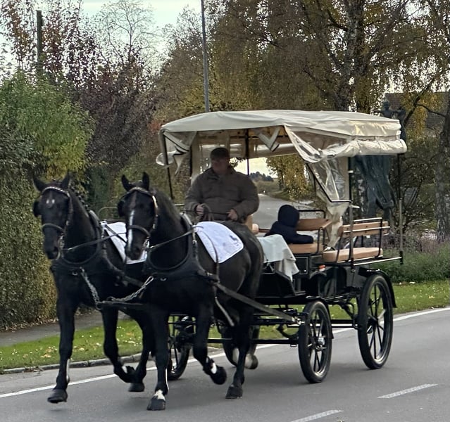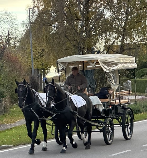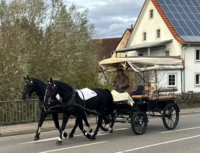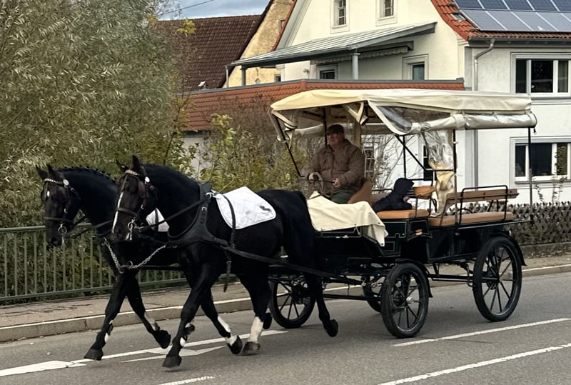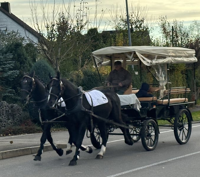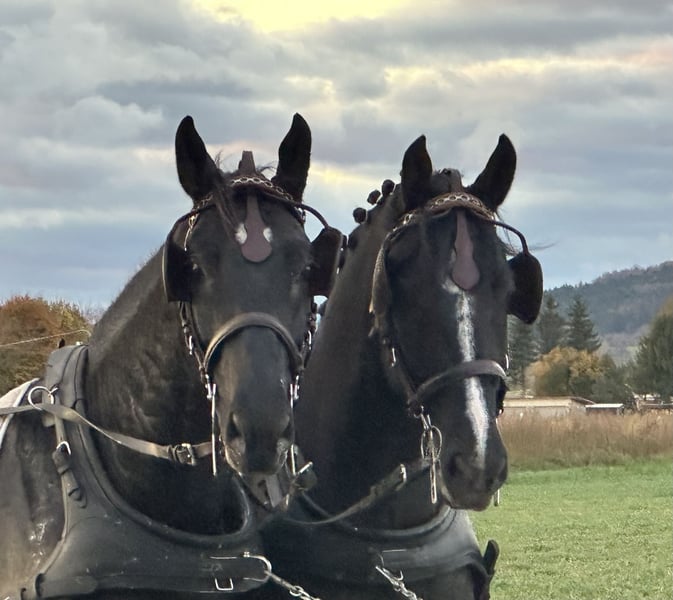 Hier sehen Sie zwei Wallache die beide ein,-zweispännig gefahren , sowie im Gelände und in der Halle geritten sind. Beide sind momentan vorne beschlagen sind total unkonzentriert beim Schmied.