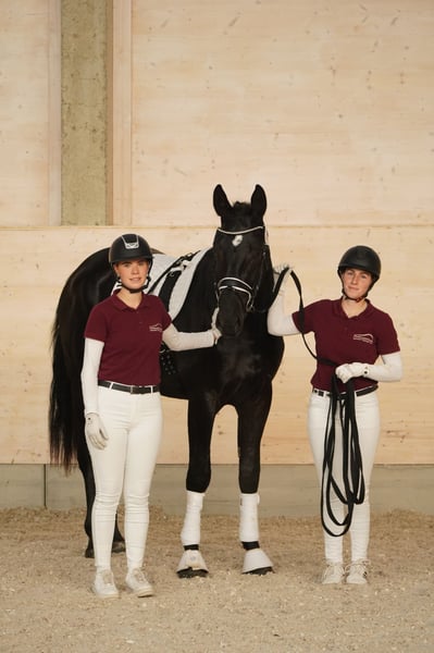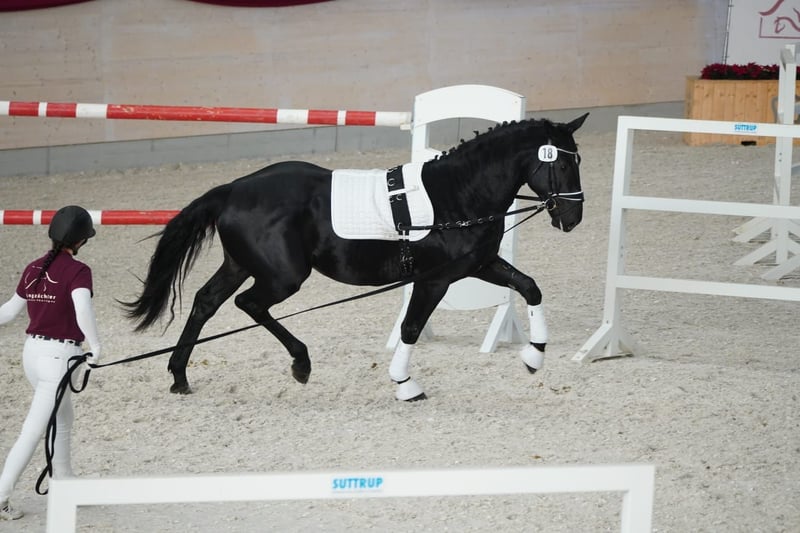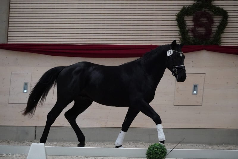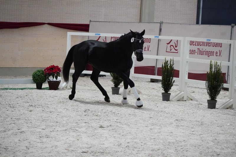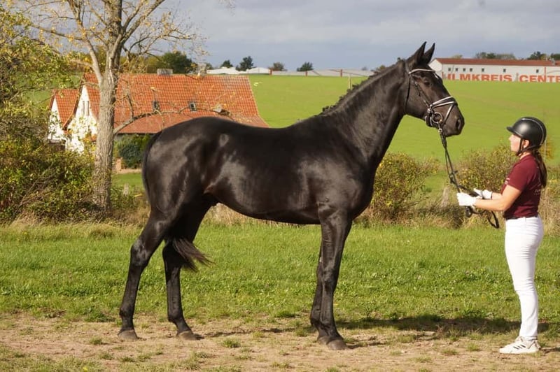 A strong sport-type Warmblood gelding is being offered on behalf of an owner – ideal for the advanced leisure rider or driver! This impressive black stallion was born in 2023. His dam is the state premium mare Zaira, bred to the Thoroughbred Rock of Romance xx for refinement. Romeo stands at 166 cm (16.1 hh), making him the perfect size for a variety of leisure activities. He was presented for the Heavy Warmblood licensing in November. Intelligent, eager to perform, and always striving to do everything correctly, he requires an experienced horseperson who can provide him with confidence and security in handling. He has been lunged during the licensing process and has developed good musculature. He also behaved well with a saddle afterward, so he was tested with rider weight. If you are interested or have further questions, please feel free to contact me. I would be happy to arrange a viewing and a meet-and-greet!