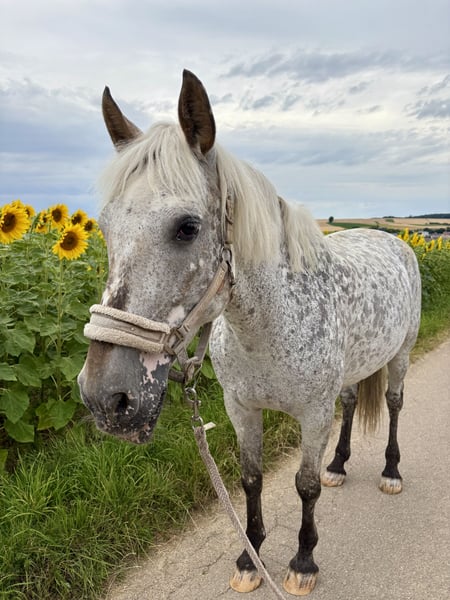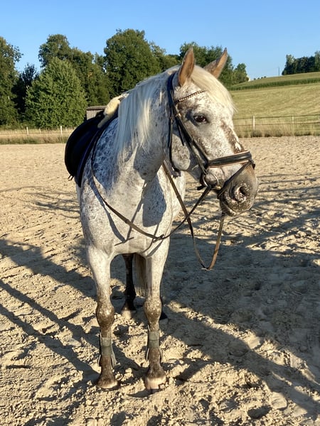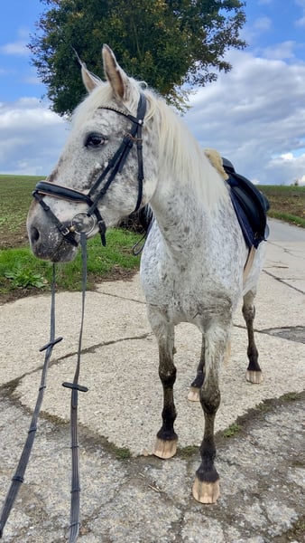 Send Tigerscheck mare with an ideal height of 1.55 m, seeking a new home due to retirement from competitive riding. The 9-year-old mare is eager to learn, willing to work, and motivated. Her previous owners rode her in lead-rein classes up to A-Dressage and she was placed in competitions, as well as in E-Jumping and eventing. She is confident going out alone in the field. Overall, she is friendly and uncomplicated in handling. Maggie is a sensitive horse and requires a confident, experienced rider. She is very social and compatible with other horses, making her also suitable as a companion horse. Maggie has equine asthma and needs a dust-free, well-ventilated environment. An open stable or a paddock box with plenty of turnout and fresh air would be ideal. She has been regularly dewormed, vaccinated (tetanus, influenza), and presented to the farrier every six weeks. She is barefoot. Her teeth were also floated in August (dental record available). She is easy to load and stands well for the farrier. Currently, Maggie is not in training due to health reasons on my part. The price will increase with further training and education. Suitable tack can be purchased additionally.
