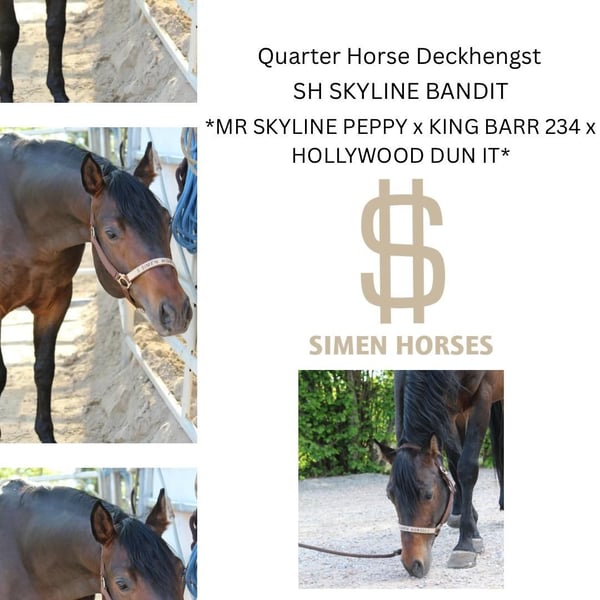 SH SKYLINE BANDIET Zeer chique en goed gefokte Quarter Horse hengst uit eigen fokkerij. Rustig karakter en braaf in de omgang. Helder hoofd. Stkm. momenteel 150cm. Papier bijgevoegd. Heeft al enkele nakomelingen, die worden opgeleid als solide recreatiepaarden, maar ook als wedstrijdpaarden. Covers in natuurlijk springen. 5 Paneel N/N. Geregistreerd in Duitsland en de VS. Kweekvoorwaarden op aanvraag!