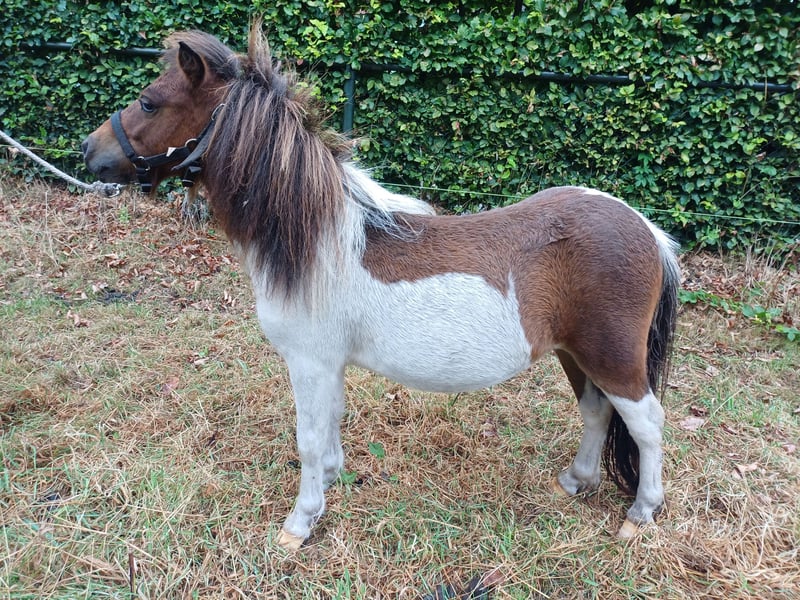 Driekleurige minishetlandhengst. Zeer beste type, hoofd en bewegingen en mooie bloedlijnen Duke stable en Bromishet. Pony is zeer mak en leergierig.