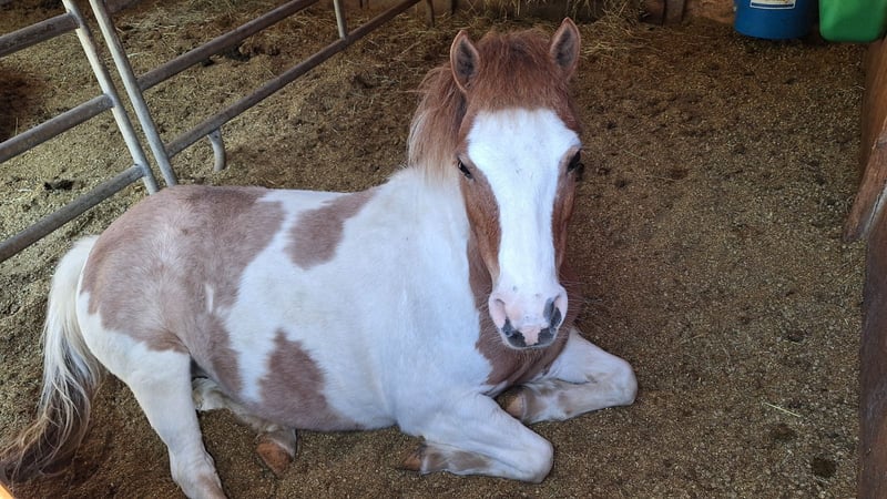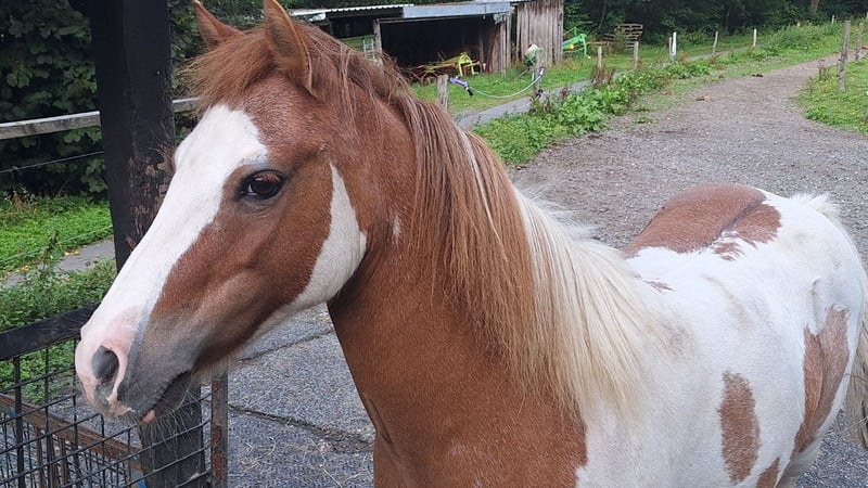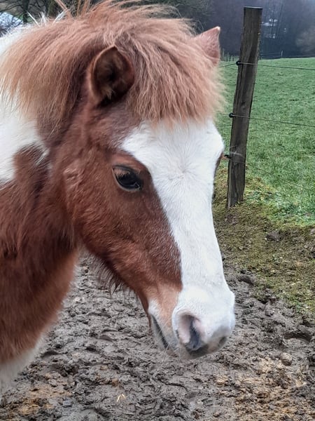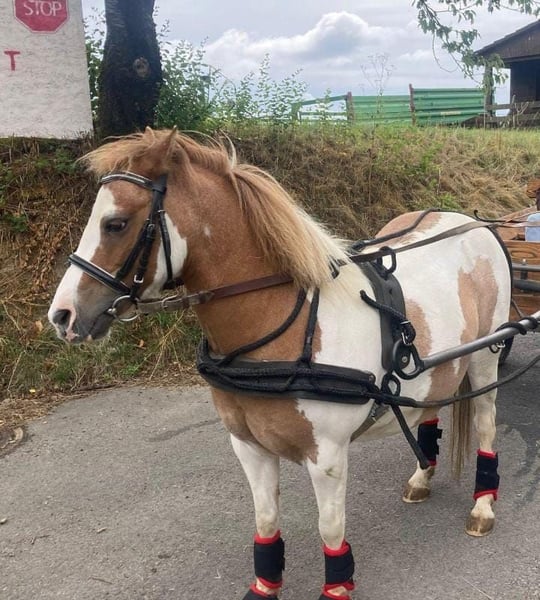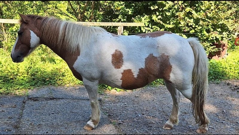 Hübsche 11 j. Irish Skewbold Pony Stute im sportlichen Shetland Typ stehend. 112 cm groß. Fuchsfalb Schecke. Darcys Reggie Lady, genannt Gipsy wurde 2021 aus Irland importiert und bei dem Vorbesitzer einspännig vor der Kutsche gefahren und von einem älteren Mädchen geritten und ein jüngeres Kind auf ihr geführt. Trotzdem sehe ich Gipsy nicht als reines Kinderpony, da sie im Umgang sensibel und bei Kindern zickig beim Hufe geben ist. (bei routinierten Erwachsenen geht das problemlos). Beim selbständigen Reiten testet sie auch schon mal. Bodenarbeit und an der Longe laufen kennt Gipsy, sie hat Freude an Beschäftigung. Bei mir war sie in den letzten 2 Jahren nur Beisteller, von gelegentlichen Spaziergängen abgesehen. Sie geht bei Spaziergängen am losen Strick ohne zu ziehen und steht auch geduldigt wenn man anhält. Ideal als Beisteller, da sie gut alleine bleibt, im Stall wie auf der Wiese und E-Zaun sicher ist. Lässt sich problemlos auf der Wiese fangen, kommt meist sogar von selber an. Gipsy kennt Kühe, Esel und umherlaufende Hunde. Gipsy lässt sich gut verladen und fährt auch alleine im Hänger. Bei mir ist sie tagsüber auf der Wiese, nachts in der Box mit Heu und Mineralfutter. Sie kennt aber auch Offenstall Haltung, das hatte sie bis Herbst. Da wir im Wolfsgebiet leben, haben wir die Pferde nachts in Boxen. Da sich Gipsy im Offenstall wohler fühlt, gerne im Offenstall oder Laufstall abzugeben. In der Herde (gemischte Herde wie Stuten Gruppe) verträglich, geht Streit aus dem Weg. Gipsy ist Ekzemfrei, 3x jährlich entwurmt, geimpft (Tetanus, Influenza, Herpes). 11/25 die Zähne gemacht, keine Zahn Erkrankung vorhanden. Gipsy geht barfuß und hat regelmäßige Hufpflege durch den Hufschmied, zuletzt 11/25. Zubehör habe ich außer ihrer Trense keins. Die Trense gebe ich gerne dem neuen Besitzer. Ich wünsche mir für Gipsy Menschen, die Zeit und Lust haben, sich mit einem Pony zu beschäftigen, egal ob nur putzen oder mehr, denn wenn sie ihre Menschen kennt ist sie ein vertrauensvolles Pony, was auch gerne kuschelt. Standort: NRW. 58540 Meinerzhagen