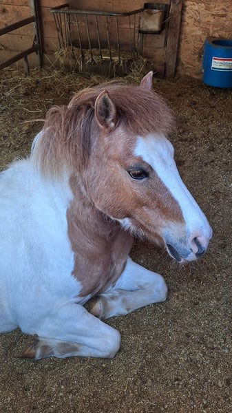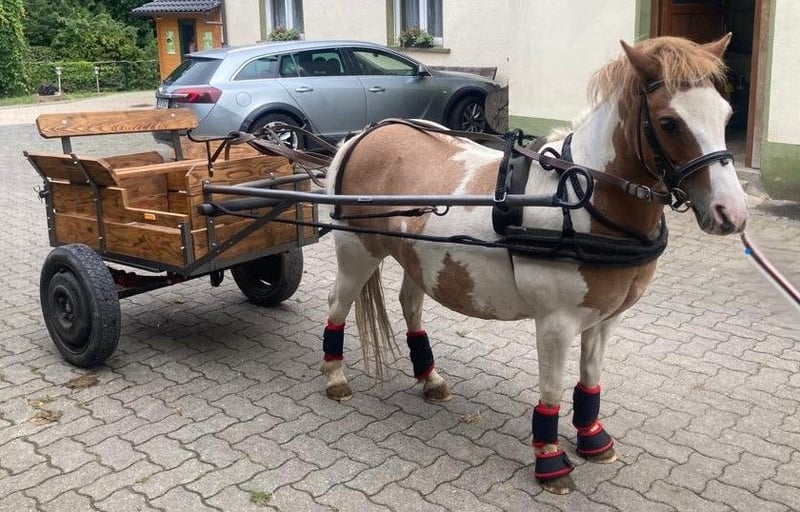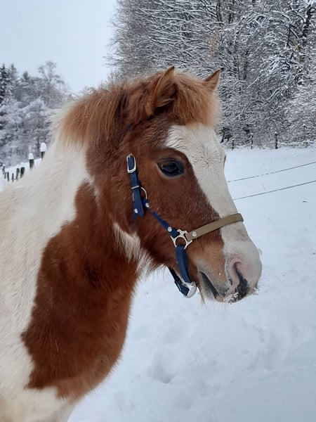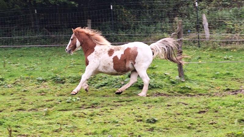 Hübsche 11 j. Irish Skewbold Pony Stute im sportlichen Shetland Typ stehend. 112 cm groß. Fuchsfalb Schecke. Darcys Reggie Lady, genannt Gipsy wurde 2021 aus Irland importiert und bei dem Vorbesitzer einspännig vor der Kutsche gefahren und von einem älteren Mädchen geritten und ein jüngeres Kind auf ihr geführt. Trotzdem sehe ich Gipsy nicht als reines Kinderpony, da sie im Umgang sensibel und bei Kindern zickig beim Hufe geben ist. (bei routinierten Erwachsenen geht das problemlos). Beim selbständigen Reiten testet sie auch schon mal. Bodenarbeit und an der Longe laufen kennt Gipsy, sie hat Freude an Beschäftigung. Bei mir war sie in den letzten 2 Jahren nur Beisteller, von gelegentlichen Spaziergängen abgesehen. Sie geht bei Spaziergängen am losen Strick ohne zu ziehen und steht auch geduldigt wenn man anhält. Ideal als Beisteller, da sie gut alleine bleibt, im Stall wie auf der Wiese und E-Zaun sicher ist. Lässt sich problemlos auf der Wiese fangen, kommt meist sogar von selber an. Gipsy kennt Kühe, Esel und umherlaufende Hunde. Gipsy lässt sich gut verladen und fährt auch alleine im Hänger. Bei mir ist sie tagsüber auf der Wiese, nachts in der Box mit Heu und Mineralfutter. Sie kennt aber auch Offenstall Haltung, das hatte sie bis Herbst. Da wir im Wolfsgebiet leben, haben wir die Pferde nachts in Boxen. Da sich Gipsy im Offenstall wohler fühlt, gerne im Offenstall oder Laufstall abzugeben. In der Herde (gemischte Herde wie Stuten Gruppe) verträglich, geht Streit aus dem Weg. Gipsy ist Ekzemfrei, 3x jährlich entwurmt, geimpft (Tetanus, Influenza, Herpes). 11/25 die Zähne gemacht, keine Zahn Erkrankung vorhanden. Gipsy geht barfuß und hat regelmäßige Hufpflege durch den Hufschmied, zuletzt 11/25. Zubehör habe ich außer ihrer Trense keins. Die Trense gebe ich gerne dem neuen Besitzer. Ich wünsche mir für Gipsy Menschen, die Zeit und Lust haben, sich mit einem Pony zu beschäftigen, egal ob nur putzen oder mehr, denn wenn sie ihre Menschen kennt ist sie ein vertrauensvolles Pony, was auch gerne kuschelt. Standort: NRW. 58540 Meinerzhagen