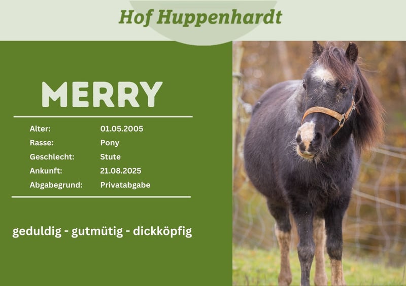 Wir suchen ein neues Zuhause für unsere Pony-Stute Merry. Die am 01.05.2005 auf den Balearen geborene Stute wurde von uns im August 2025 aufgrund eines Krankheitsfalles des Besitzers übereignet. Bei uns zeigt sie sich neugierig und aufgeweckt. Sie steht bei uns zusammen mit anderen Großpferden in einem Offenstall und genießt die Weidezeit in einer großen gemischten Herde. Sie kennt Spaziergänge und Bodenarbeit. Merry ist Menschen gegenüber sehr aufgeschlossen, hat aber Ponytypisch eine Dickkopf und macht auch gerne ihr eigenes Ding! Wir wünschen uns für sie ein neues Zuhause mit eigenen Menschen, wo sie ein schönes Ponyleben führen darf. Wir sind ein Tierheim für Großtiere. Alle unsere Schützlinge werden nach positiver Vorkontrolle und gegen eine Schutzgebühr vermittelt. Gerne können die Tiere nach vorheriger Terminabsprache bei uns auf dem Hof besucht und kennengelernt werden.