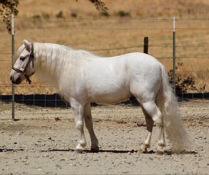ONLINE AUCTION Place your bids at www.PlatinumEquineAuction.com Starting Bid $3500 Auction ends September 22nd, 2024 Need a new saddle? Check out White Rock Saddles on our website or Facebook! Coco is a 5-year-old white Shetland pony with a unicorn-like appearance and a personality reminiscent of a friendly puppy! He stands 10.2 HH or 42 inches. He has undergone extensive socialization, having been raised from a colt mostly inside a house, resulting in an exceptionally sweet and personable nature. He always wants to see what you’re doing and will follow you everywhere you go. He’s been used to leadline toddlers down city streets, with loads of cars and loud noises. He is very familiar with the hustle and bustle of town and nothing seems to phase him. He has also been rode out by older kids and will go anywhere you point him, demonstrating his adaptability and willingness to explore diverse environments. He goes over all the trail obstacles like the big horses and is very willing! He will neck rein and has even trotted around the playday patterns. Coco also does some tricks and will lay down and is starting to sit. He has been hauled to local rodeo/events and doesn’t blink an eye. Everyone loves Coco, horses, farm animals and people! He stands at the cross ties, clips, picks up all his feet, loves to be groomed and bathed. He doesn’t have a mean bone in his body and loves treats. His gentle disposition and captivating presence make him an invaluable companion. They just don’t come any prettier OR any sweeter than him! His little saddle will be INCLUDED with him. He is located in Bitterwater, CA. For more info contact Cheyenne Rey 831-537-8746. ONLINE AUCTION Place your bids at www.PlatinumEquineAuction.com Starting Bid $3500 Auction ends September 22nd, 2024 Need a new saddle? Check out White Rock Saddles on our website or Facebook!