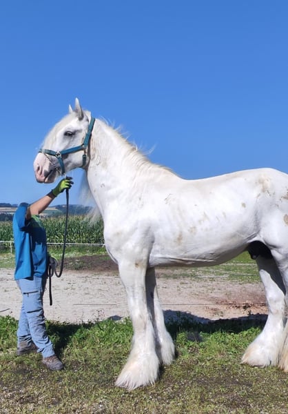 Elegant Shire Horse Stallion for Sale – Perfect for Leisure and Hobby Riding We are offering an impressive Shire Horse stallion, born in 2016. This magnificent grey impresses with his imposing stature and calm, friendly demeanor. Standing at 180 cm, he is a true eye-catcher and ideally suited for recreational riding. The stallion is healthy, alert, and well-trained. He is extremely gentle in handling and easy to manage both in the field and in stable routines. His calm nature makes him an excellent partner for experienced riders as well as ambitious beginners seeking a reliable leisure horse. Please feel free to contact me for more information or if you are interested. Viewing and trial riding are available by appointment.