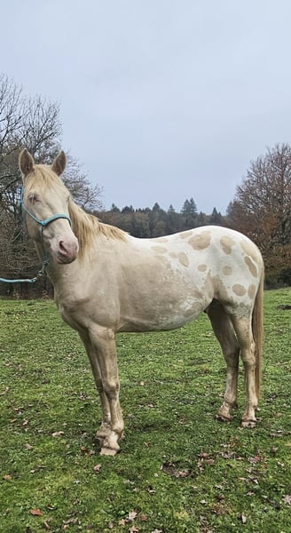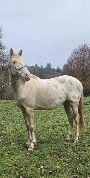 Ganzes (noch nie gedeckt) 4 Jahre alt 1,55 m. Cremefarbene (Hmz) + Lp + 2 blaue Augen Papiere OC, Vater portugiesisch, Mutter spanisch x Apaloosa Freundlich, lebt tagsüber auf der Weide mit Hengsten, respektiert Zaun, menschenbezogen Aktuell beim Tierarzt, Zahnarzt, Osteopathen Ideal für Sport, Springen, Dressur, Vielseitigkeit oder Freizeit, oder Zucht, falls Hengst gehalten wird, da homozygot in der Cremefarbe Ohne PSSM1, Fell getestet A/a E/E CR/CR LP/n
