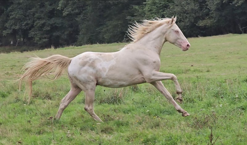 Entire (never been bred) 4 years old 16.1 hh. Cream (homozygous) + long mane + two blue eyes OC papers, Portuguese sire, Spanish dam x Appaloosa Gentle, lives in a paddock with geldings, respects fences, human-oriented Up to date with dentist and osteopath Ideal for sport / show jumping / dressage / endurance or leisure, or breeding if kept entire, as homozygous for the cream gene PSSM1 negative, coat tested A/a E/E CR/CR LP/n