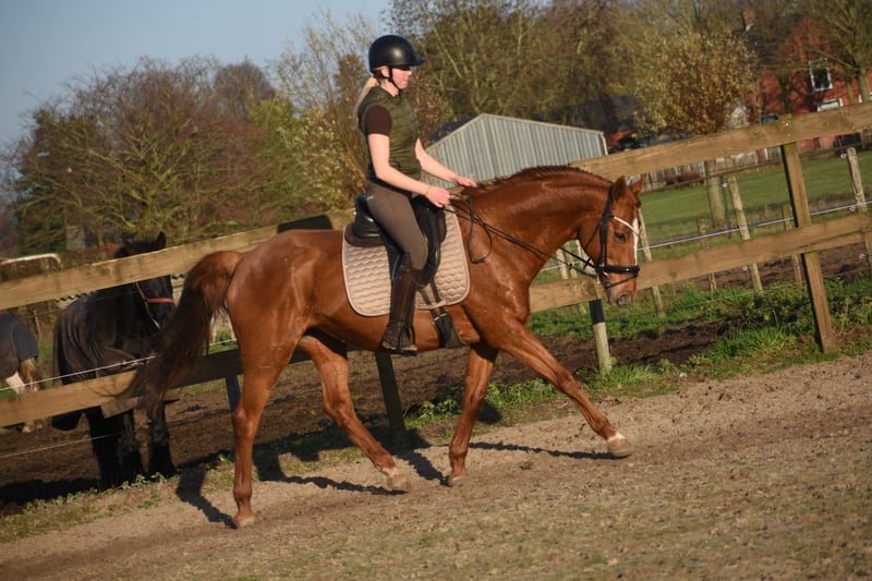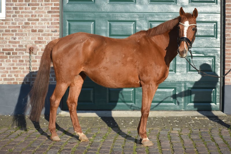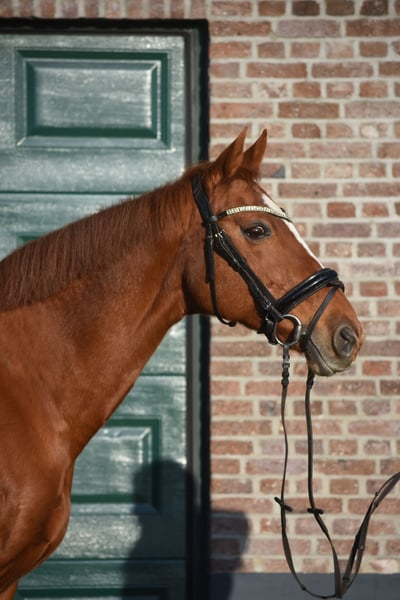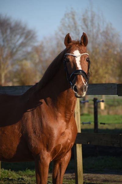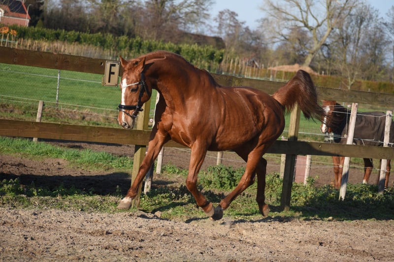 Dana is truly a picture-perfect mare. She has a stunning golden chestnut coat, a beautiful build, and an expressive head. Her previous owners mainly rode her outdoors, but she has been riding beautifully in the arena right from the start. Born in 2007, she looks fantastic and certainly does not appear her age. Her experience makes her a safe choice for a beginner or anyone who simply appreciates an easy-going horse. Dana stands approximately 16.0 hands high. She has a solid pedigree: Dow Jones Courcel (Arabian) x Shardari x Little Credit. It’s quite possible she could foal again if you decide to breed her. Did you know that mares can have foals well into old age? They do not experience menopause like humans. In any case, Dana is a perfect companion: sweet, social, easy to handle, trailer- and traffic-safe with us and previously. €3,950 including brand saddle and complete bridle.