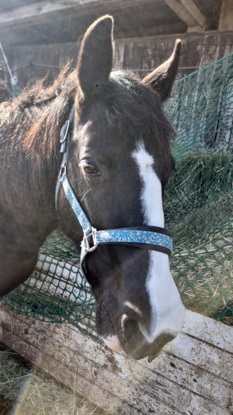 Very personable small pony mare available as a companion horse. Most recently, she was used as a therapy pony and for guided rides. Due to developing an allergy to ragweed at her previous stable, she has relocated here and no longer has any respiratory issues. Unfortunately, she tore her superficial digital flexor tendon support band (where and how she doesn’t know), which now makes her unrideable. We would love to give her a happy life as a companion horse; she is herd-friendly, not dominant, and seeks human contact very much.