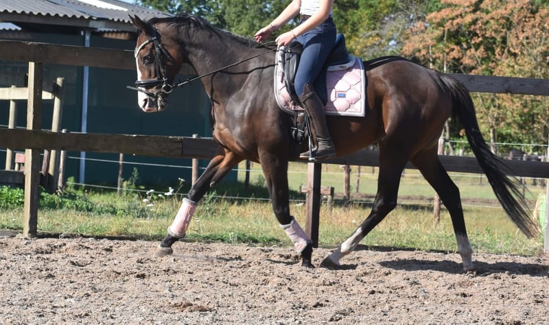 Paddy est une jument de 9 ans d’environ 1,62 m, issue d’un élevage de Leading Light x Caoba par Hernando (FR). Elle possède une silhouette élégante mais solide, avec de belles longues jambes, et se montre agréable à monter. Paddy n’est en aucun cas paresseuse et aime travailler pour son cavalier. Elle a une bouche douce et réagit délicatement aux aides, sans nécessiter une main lourde. Elle est habituée au trafic, en bonne santé et sans défauts. Elle est également très intéressante pour l’élevage ! Récemment, elle a été traitée chez le vétérinaire-dentiste. Prix : 5950 € (TVA incluse), avec selle de marque et couvre-rein.