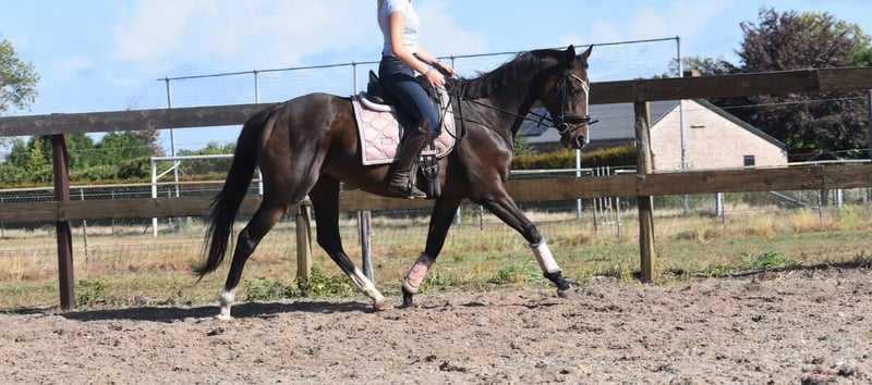 Paddy is a 9-year-old mare approximately 1.62 meters tall, with a pedigree that includes Leading Light x Caoba by Hernando (FR). She has an elegant yet solid build, with beautiful long legs, and is a pleasure to ride. Paddy is far from lazy and enjoys working for her rider. She has a soft mouth and responds well to the aids; she does not require a heavy hand. Paddy is traffic-safe, healthy, and free of any vices. She is also very interesting for breeding purposes. Recently, she was treated by the dentist. Price: €5,950, including brand saddle and saddle pad.