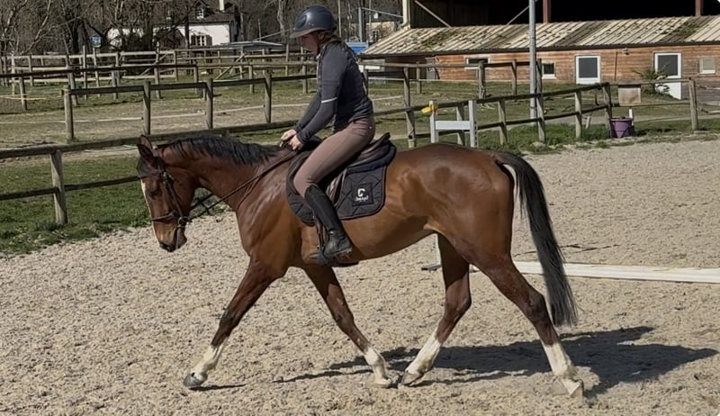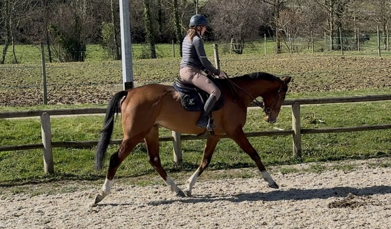 Four-year-old AQPS (Thoroughbred x Selle Français) A magnificent horse, gentle with everything (loading, van, grooming, farrier…) and very human-oriented, with a big heart! Good mouth, enjoys hacking alone or with company, currently lives in a box at night and in a paddock with friends during the day. He is starting to jump under saddle and has seen some cross-country obstacles. Ideal for someone looking to produce a riding horse, willing and attentive, he is sure to steal your heart! Good hooves (rear feet shod, but front can also be shod). Transport possible at your expense. Price may increase with training and competition outings.