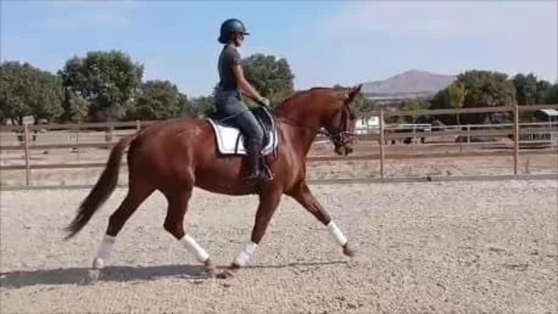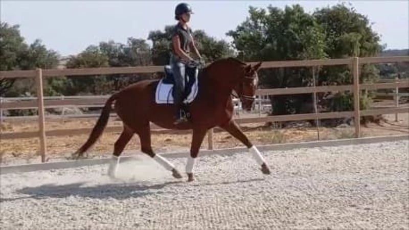 Trabaja con buen nivel de doma: tres aires, apoyos y comenzando cambios de pie. 174 cm de alzada, presencia e impacto visual innegable. Dorso largo y musculado, cuello bien insertado y tren posterior fuerte. Buena actitud en pista, respetuosa en el manejo y fácil de llevar para distintos perfiles de jinete. Apta para doma, salto o completo. Excelente opción también como proyecto de cría deportiva orientada a tamaño y potencia.