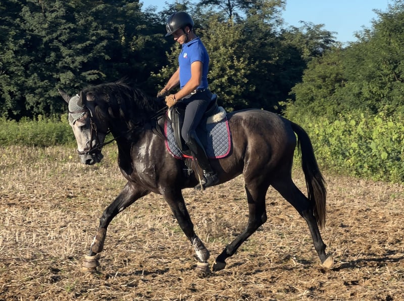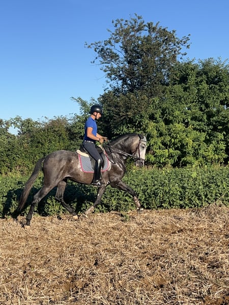 CDE (Spanish Sport Horse), a cross between PRE and Holsteiner, with full breed documentation. He is 10 years old, gelded, and stands 1.72 m at the withers. He has an excellent physique, an impressive presence, and a very gentle, playful, and well-trained character up to M/D level. He has competed successfully in FISE competitions. He performs lateral movements, half-pass, pirouettes at walk and canter, simple and flying changes, even in series (up to two tempi). Easy to ride with bridle and bit, he is suitable for hacking and ideal for amateurs or those learning. Available for any test.