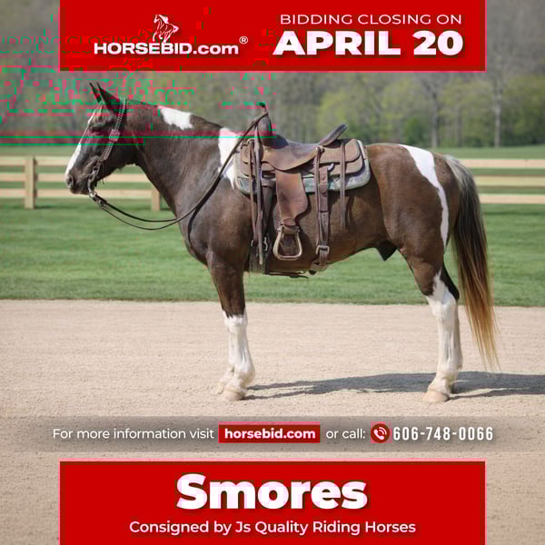 ⚜️𝐭𝐡𝐞 𝓔𝓵𝓲𝓽𝓮 𝐒𝐩𝐫𝐢𝐧𝐠 𝐂𝐥𝐚𝐬𝐬𝐢𝐜⚜️ Happening now thru MONDAY | APRIL 20th - Available EXCLUSIVELY on HorseBid's website! For more details and to register visit: www.Horsebid.com CONSIGNOR CONTACT: Js Quality Riding Horses 606-748-0066 LOCATION: Wallingford, KY BREED: Spotted saddle horse REGISTERED: No REGISTERED NAME: Smores COLOR: Chocolate and white HEIGHT: 15 AGE: 12 GENDER: Gelding We are proud to introduce “Smores” a 15 hand 12 years young spotted saddle gelding. Smores is the kind of horse you wanna go out and ride, whether it’s 70° and the sun is shining or -2° and snow falling. Smores has a good solid walk, a beer drinking gait, and even can lope like a quarter horse if asked. There’s not a hill to steep or a creek to deep, s’mores is ready to hit the trail and get you wherever your wanting to go safely and smoothly. Smores has a good smooth gait that will get you wherever your heart desires , in a safe, fashionable, and comfortable manner ! Wanna drop your reins, enjoy a cold one while hitting the trails? Smores is your guy ! Smores stands to be mounted, saddled, bridled, he stands good for the farrier and loads with ease. S’mores is a trail superstar, but he also is wonderful in the arena and will work the rail , circles, or whatever else you may want. Want to go to the obstacle courses ? Fun shows ? Smores got you covered ! Smores is built to last, he’s sturdy made like a stock horse, big boned and has good solid hooves to last a lifetime ! S’mores has a good neckrein to him, he stops on whoa, and will ride around like a quarter horse. Smores stays broke with time off, he will ride out alone or by himself and doesn’t care to lead the trail or follow behind. S’mores has been rode all over national forests and has experience in all terrains. If your wanting a good safe solid trail mount, or a fancy gelding to hit the arena on, look no further s’mores is ready for his next adventure!