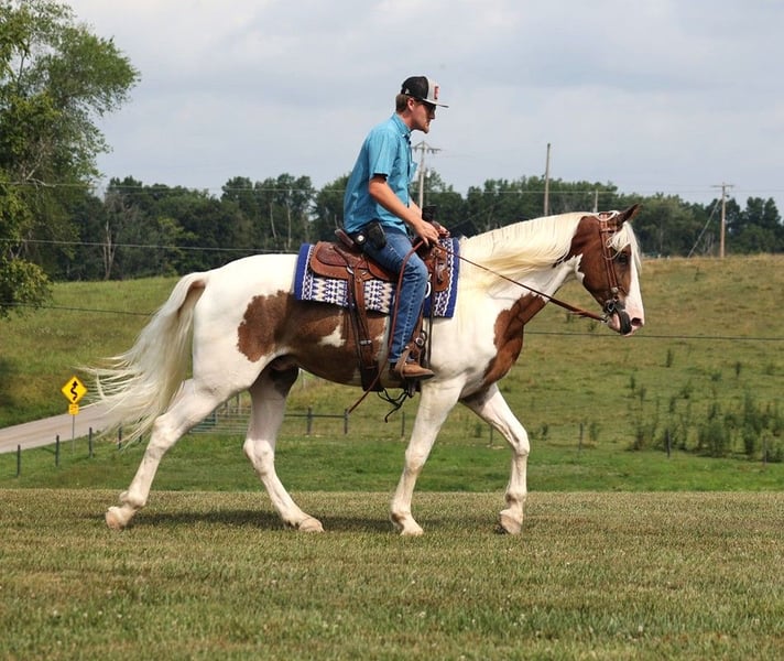 ONLINE AUCTION Place your bids at www.PlatinumEquineAuction.com Starting Bid $3500 Auction ends September 1st, 2024 Need a new saddle? Check out White Rock Saddles on our website or Facebook! Scout is an eye catching sorrel roan tobiano, Missouri Foxtrotting/Tennessee Walking Gelding gelding that is standing 15.2-15.3hh and 4 yrs old. Scout has been on camping trips, picket line tied and hauled to several states. He will flatfoot walk on a loose rein or he can move on out if you ask. He has a smooth and natural 4-beat gait that anyone will enjoy riding on! Scout has been shown at local fun shows in pleasure classes and seen it all from the bright lights to hearing those blairing loud speakers. Scout has seen it all and handles everything in stride! He has been exposed to all kinds of wildlife such as deer or turkey or other animals like cows or dogs and will go anywhere that he is asked to. He has been rode many miles in the mountains of Eastern Kentucky and encountered every obstacle possible on the trail. He will go up or down even the steepest slopes, across deep creeks, over downed trees, and over all types of rough terrain while still being sure footed. He has been rode in traffic, and is very traffic safe around cars, semi, log, and dump trucks. If you are looking for that special trail riding partner, then look no further!! Feel free to call Trevor Patrick 606-516-8069 with any questions. ONLINE AUCTION Place your bids at www.PlatinumEquineAuction.com Starting Bid $3500 Auction ends September 1st, 2024 Need a new saddle? Check out White Rock Saddles on our website or Facebook!
