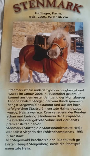 Stenmark is een expressieve en krachtige hengst. Topfit. Goedgekeurd. Verrichtingsonderzoek voltooid (mennen en rijden). Hij heeft zijn verervingskwaliteit al bewezen met talrijke nakomelingen. Dekt via natuurlijke dekking. Geregistreerd in Duitsland. Dekvoorwaarden op aanvraag. Info: De flyerafbeeldingen in de advertentie waren van eerdere reclame in 2009/2010.