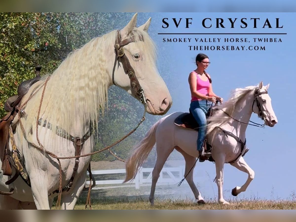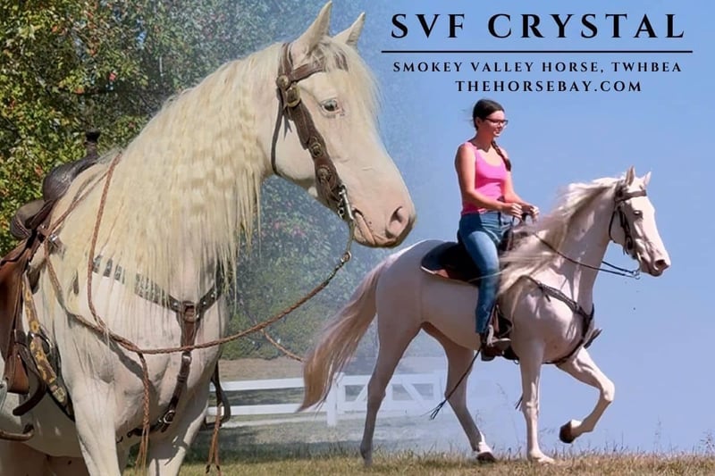 Crystal is truly one of a kind, call her a unicorn in the looks department! Standing a perfect 14.1hh and at 4 years old (coming 5 this June), this beautiful double registered Smokey Valley Horse/TWHBEA Maximum Sabino Mare is the total package. Crystal is a Smokey Valley Horse, which is a modern recreation of America’s historic smooth gaited traveling horse, bred for effortless, ground-covering comfort over long distances. Her natural four-beat gaits (including a running walk and rack) deliver that famous “magic carpet ride” that you get even at varying speeds, with no jarring trot or pace to interrupt your ride. This means miles of trail riding without the fatigue that comes from posting or enduring rougher movements that you would get from other breeds. Crystal’s natural gaits let you sit deep and relaxed in the saddle while she glides along efficiently due to her significant overstride that is purpose-bred into Smokey Valley Horses. Beyond her nice ride quality, Crystal is as sweet as they come, a true “in your pocket” personality that’s gentle, willing, and people-oriented. She’s broke, sound, and sane, with rock-solid trail and ground manners. She checks a lot of the boxes that most riders are looking for: ✔️ Stands for mounting and dismounting ✔️ Stands quietly for the farrier or vet ✔️ Stands for bathing ✔️ Quiet while tacking up and grooming ✔️ Dog friendly ✔️ Traffic safe ✔️ Can ride out solo ✔️ Rides through water, over bridges, and logs ✔️ Will pony other horses ✔️ Loads and unloads trailers ✔️ Stays tied without fussing ✔️ Impeccable Ground Manners ✔️ No Buck, Rear, or Bite Despite being 14.1hh, her stocky, muscular build means she can comfortably carry most adult riders (or make a perfect dream horse for a lucky little girl!). Crystal recently returned from three months in the rugged desert trails of Arizona, where she added valuable experience to her already impressive resume. She handled the challenging terrain like a pro, often serving as the mount of choice for Dr. Bob Coleman, owner of Smokey Valley Farms. The trails out in Arizona that would test most horses were simply a walk in the park for her, proving her sure-footedness, stamina, and willingness every step of the way. Anywhere you take Crystal, she grabs the attention and steals the spotlight with her long, flowing mane and tail! If you want flashy, she’s the definition! Crystal is forward and responsive, moving willingly off light cues and stopping on a dime when asked. That said, she is straightforward and honest to ride and does not require an advanced rider, but an intermediate rider with good hands and a solid, independent seat, ideally someone with experience riding gaited horses who is confident and can keep her balanced in her natural gait. She would be an absolute dream for a kid or little girl looking for that perfect step-up trail horse. With her flashy looks and forward drive, she offers more “go” than your typical trail horses, but because of her kind nature, you’ll still feel in control and confident in the saddle. She has solid experience in the show ring from our local gaited horse shows and youth classes, so she’s ready to hit the trails or the arena with her new rider. Kids won’t have to worry about outgrowing her anytime soon; she’s the kind of horse a young rider can grow with for years!