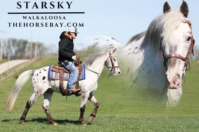 OPEN BIDDING ON THEHORSEBAY,COM. SALE ENDS ON 04/30. More information is available on the website, including an UTD vet inspection, Coggins, video, images, and the owner's contact information to ask questions, request information, or make arrangements to come to visit. Are you looking for a safe… gentle… NON-spooky… reliable… horse for trail riding??? You have found your perfect match!!! Meet Starsky, the most unique horse we have ever offered! Starsky is a nicely built, 14.2h, 15-year-old, Leopard, Walkaloosa Gelding!!! We originally sold Starsky and several others to a long-time customer in California. This lady has trail ridden all of her horses and mules and always loaned them out for her friends to come over and ride. She has owned Starsky for almost 4 years. But at the age of 84 years old, she had an accident where she tripped over her dog leash and broke both knees and her wrist. Now, 6 months later, still with a long road to recovery ahead of her and barely being able to walk without assistance, getting back to caring for her herd of horses/mules and trail riding are far, far out of the question. She sent her crew back to us in January and requested that we find them another great home, as we intend to do!! Starsky was one of her favorites to loan out for her friends and neighbors to ride! She said he would always care for anyone, regardless of how old or young they were, sit there, and Starsky would do the work and keep them safe!! Starsky has been on several camping trips to different states, ridden in several parades, and shown at local fun shows where he always got a ribbon. Starsky has the most natural 4-beat gait, and he will flatfoot walk on a loose rein as long as you like, or he will move out easily. He is safe for all types of riders. He has been ridden around farm equipment, ATVs, over large noisy tarps, and has also had guns shot off of his back. No matter where he goes or what he does, he is not spooky on the trails; he is always great! Starsky has been exposed to all kinds of wildlife, such as deer, turkey, and other animals like cows or dogs, and will go anywhere that he is asked to. He has ridden many miles on the beaches of California, in the mountains of Eastern Kentucky, and encountered every obstacle possible on the trail. He will go up or down even the steepest slopes, across deep creeks, over downed trees, and all rough terrain while still being sure-footed. He has been ridden in traffic, and is very traffic safe around cars, semi, log, and dump trucks. He has a great personality and attitude about whatever he is asked to do.