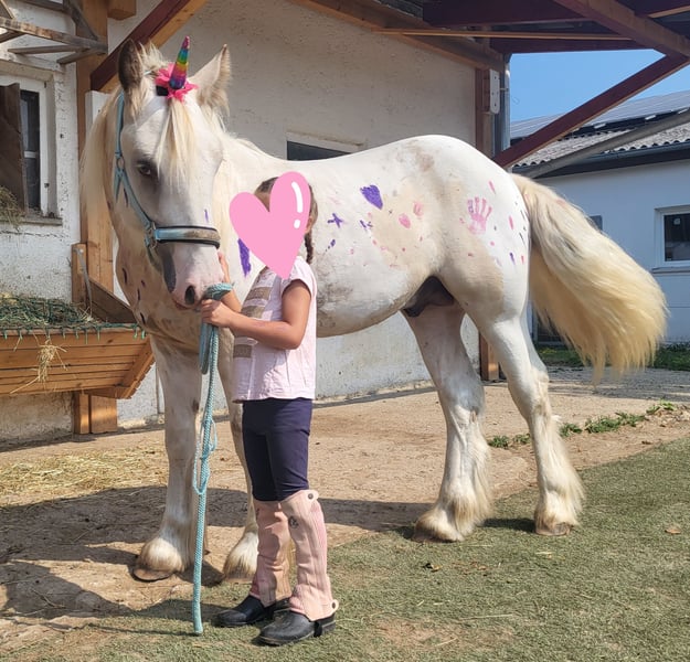 Suche für unseren Tinker Hengst Fridolin (geb. Mai 24) einen Bestplatz. Er ist kein Notverkauf und wird nur in allerbeste Hände verkauft. Menschenbezogen und absolut unkompliziert im Handling. Er kennt bereits alles was ein Jährling kennen muss. Hänger, Hufe geben, Hufpfleger, Putzen, Spazieren gehen, alles kein Problem für ihn. Kommt angerannt von der Koppel wenn man ihn ruft. Er kann auch alleine von der Herde weg und ist ein super neugieriger, lieber kleiner Kerl. Er wird auch von meiner 6 jährigen Tochter geputzt, bemalt und ist bei jedem Unfug dabei. Fridolin ist bei uns im Offenstall geboren und kennt Hunde, Katzen, Kinder, Traktoren und alles was das Leben auf dem Hof so mit sich bringt. Seine außergewöhnliche Farbe, sein toller Behang und seine liebenswerte Art machen ihn einfach zu einem Traumpferd. Mutter ist eine 100% Lebensversicherung die unerschrocken, mutig, für alles zu haben ist. Vater der bekannte Hengst aus Holland Legend of Heavenlysmile, der auch von kleinen Kindern geritten wird und absolut klar im Kopf ist. Seine Mutter ist 138 cm und Vater 162 cm, wir gehen also von einem Endstockmass 150 +/- aus. Er hat also sehr viel Potential zum perfekten Freizeitpartner.